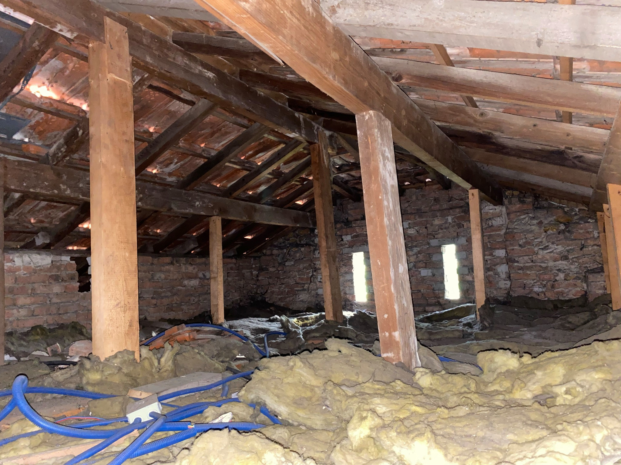 Avant. Photo des combles perdus avant travaux. Bien que ce chantier ait été plutôt un modèle du genre, il a connu comme toujours ses aléas. Ici, en cours de chantier, l’architecte a découvert que la charpente d’origine était grignotée par les capricornes, des insectes xylophages moins nocifs que les termites mais qui peuvent causer tout de même de vrais dommages, reconnaissables par de gros trous en biais. « Ce n’était pas très grave pour la charpente car nous allions refaire le toit plus haut, mais le plancher était attaqué et nous avons dû le déposer et le remplacer partiellement », explique-t-elle.