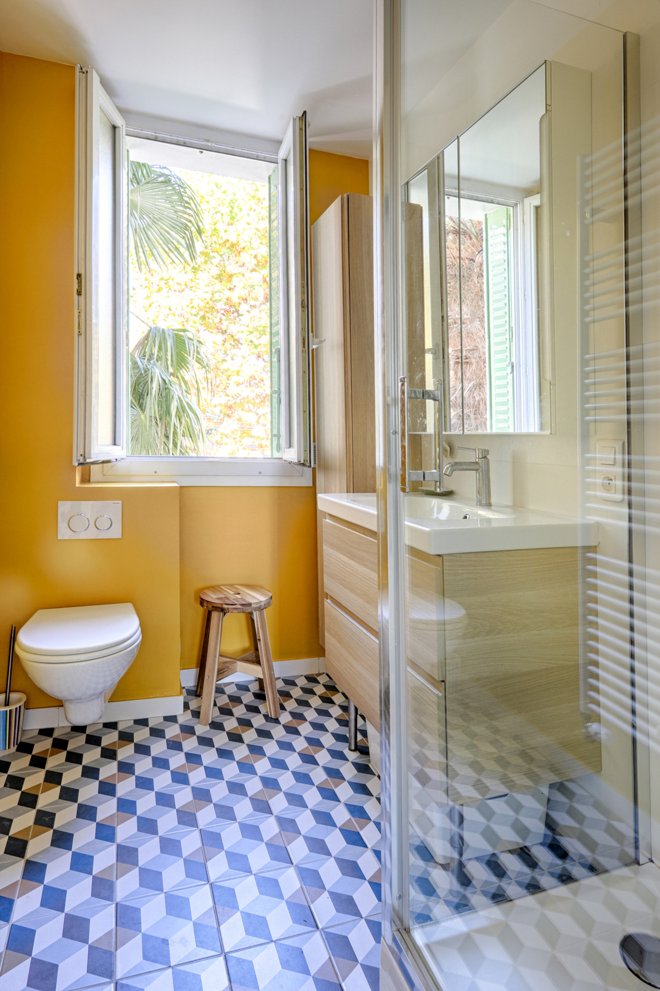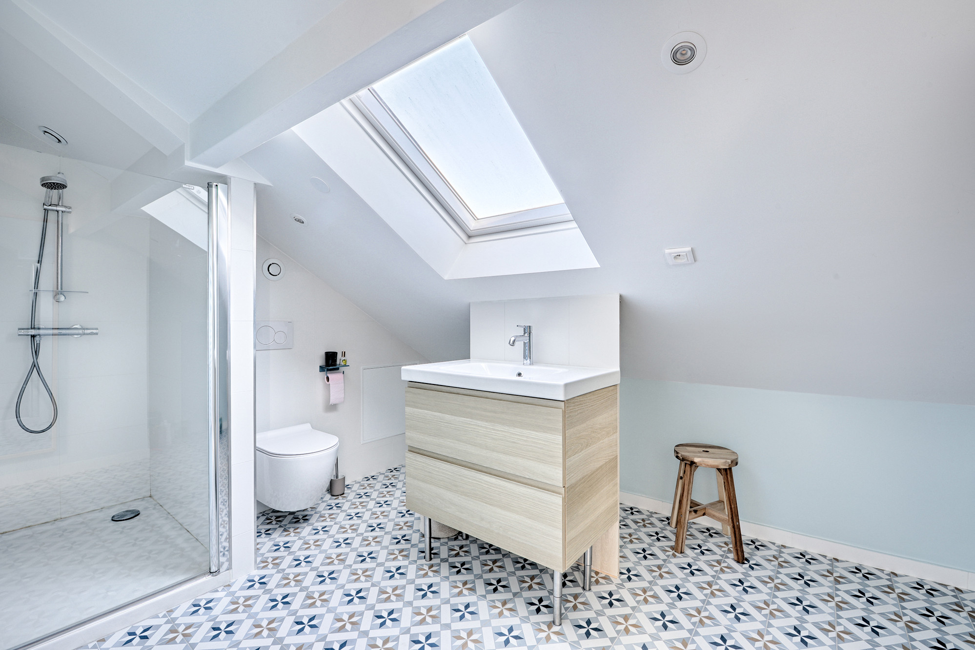 Après. La salle de bains a été réagencée avec une douche et des couleurs choisies par les propriétaires. Elle paraît beaucoup plus grande et son meuble vasque offre davantage de rangements alors qu’elle a été réduite d’1 m², cédé à la circulation pour permettre la création du nouvel escalier menant aux combles.