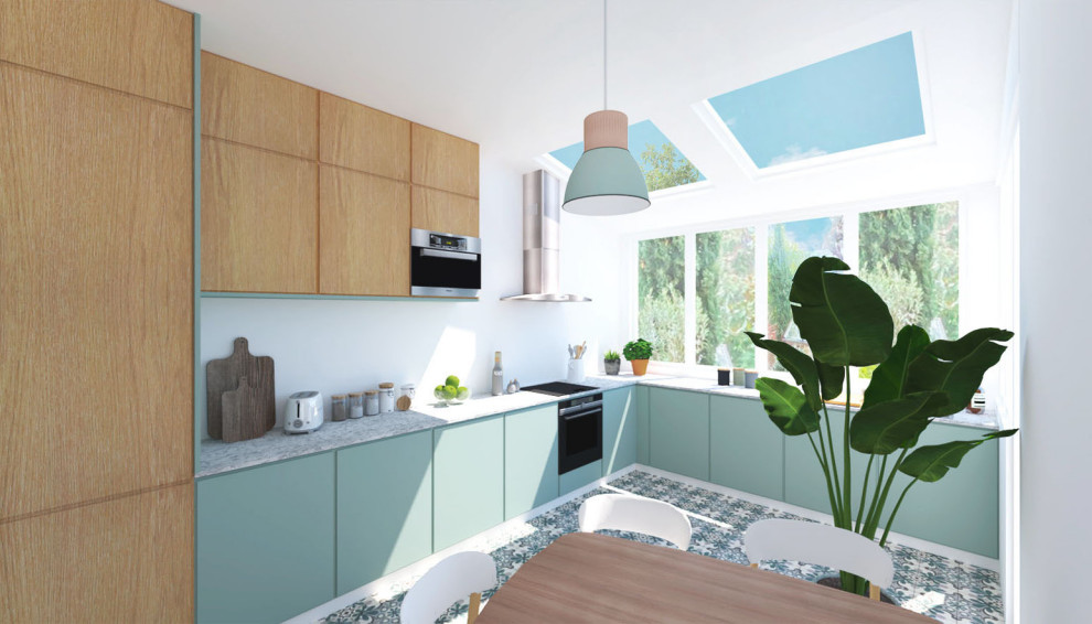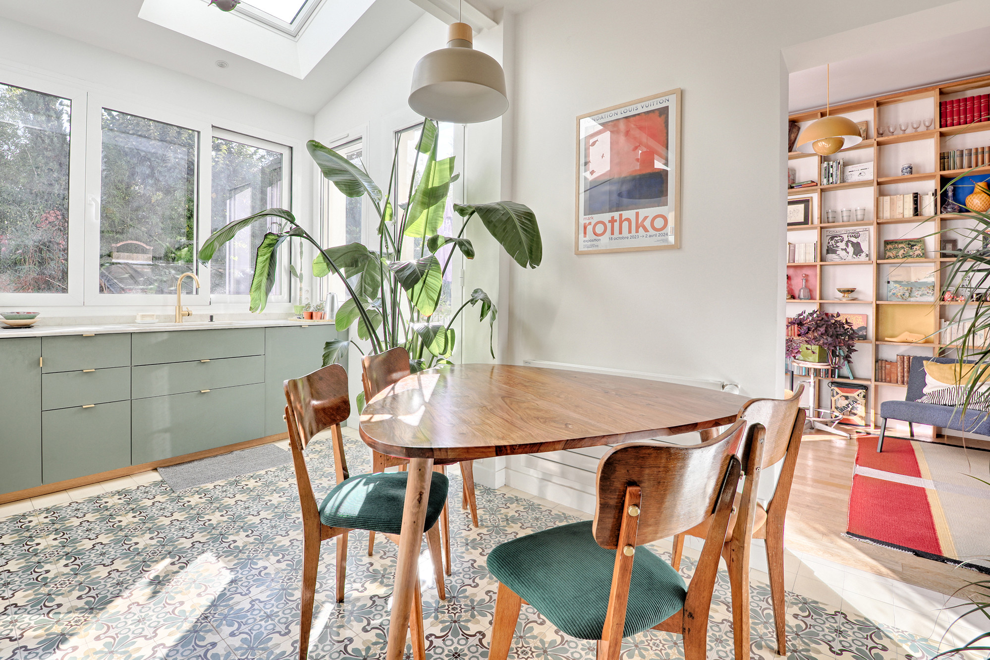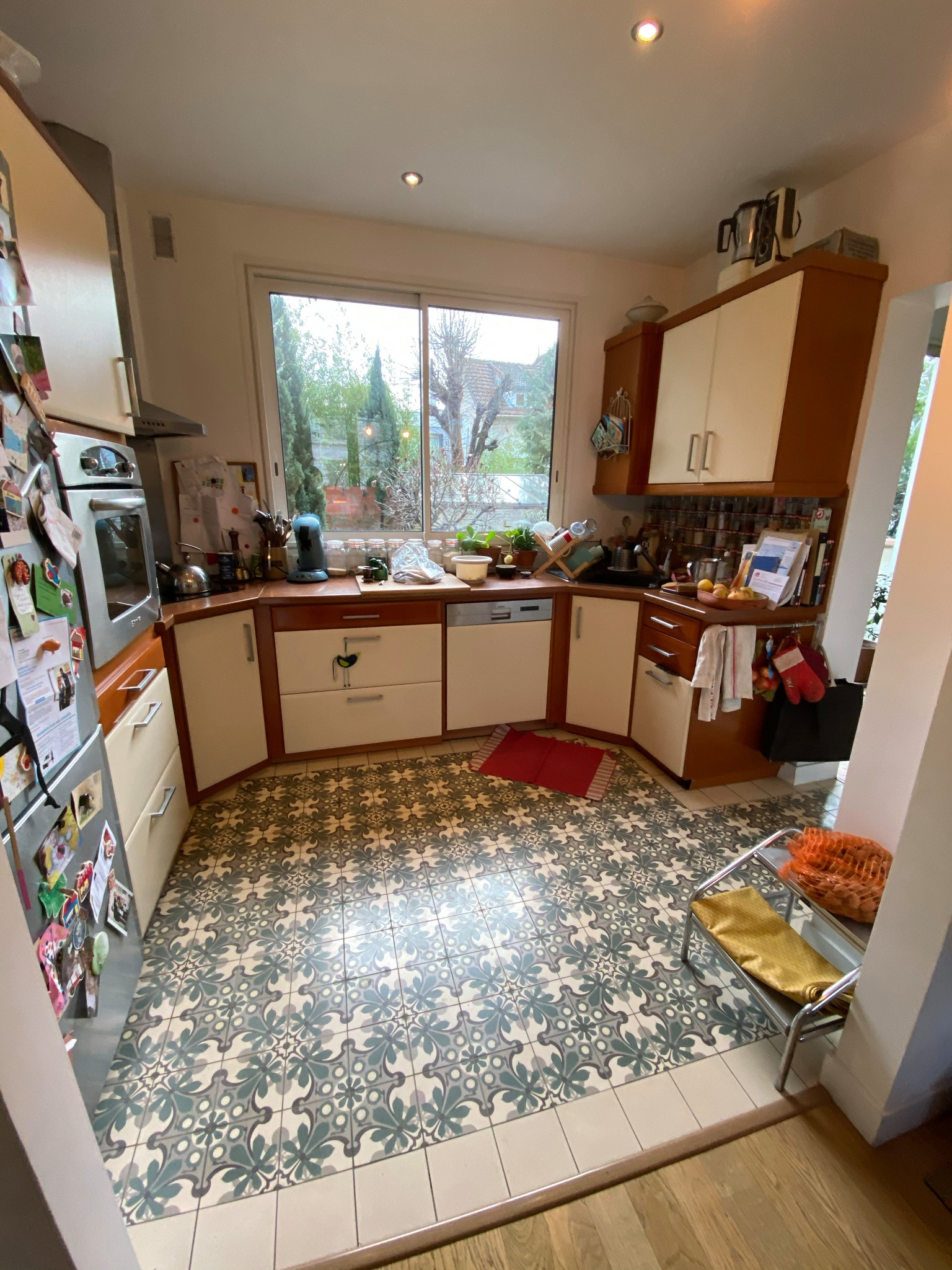 Le sol de la cuisine a également posé question, car les propriétaires souhaitaient conserver les carreaux de ciment existants. Il a été possible de retrouver la même référence et d’étendre leur superficie. Ils ont été mis en valeur façon tapis avec un contour en carrelage blanc.