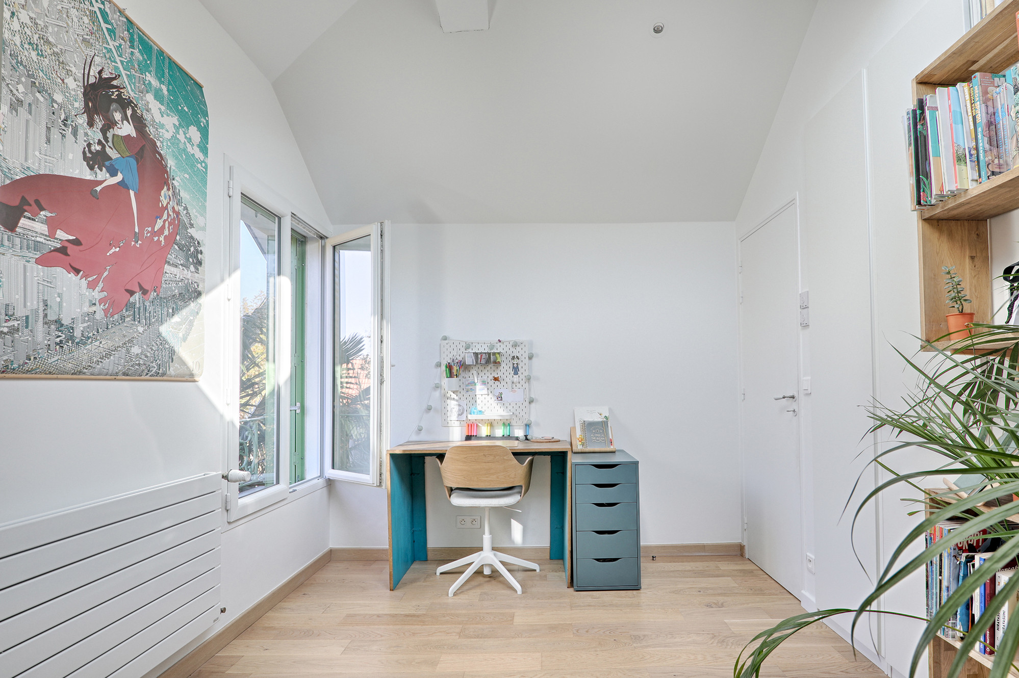 La demoiselle est passionnée de mangas et de films d’animation japonais. Le bureau a été choisi de la teinte de son tableau préféré.