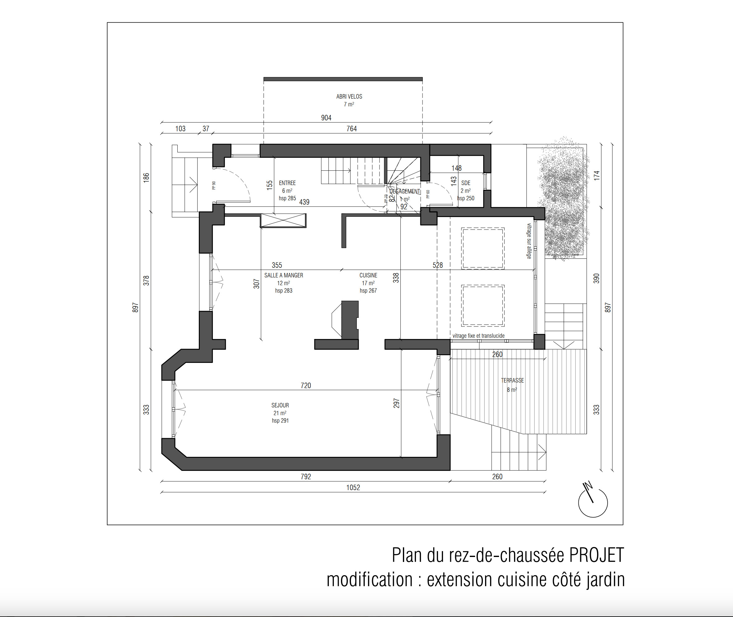 Cette coupe résume les deux extensions de la maison. Sur la gauche, le volume agrandi sur le jardin correspond à l’extension de la cuisine. Sur la droite, on distingue l’extension de la chambre parentale au-dessus du bow-window existant du salon que nous allons découvrir de l’intérieur, en montant à l’étage.