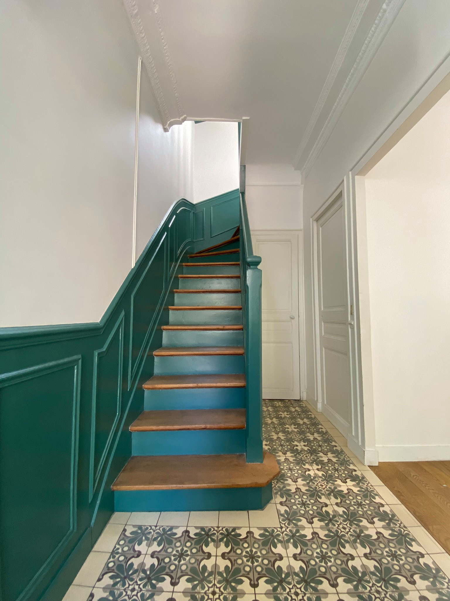 Après. En effet, c’est le vert du carreau de ciment qui a été retenu pour parer l’escalier et inspirer les colombages vert d’eau à l’extérieur. C’est d’ailleurs le père de famille qui a peint entièrement l’escalier, tenant à faire baisser le coût de la main-d’œuvre sur ce poste et ayant envie de s’impliquer dans son chantier.