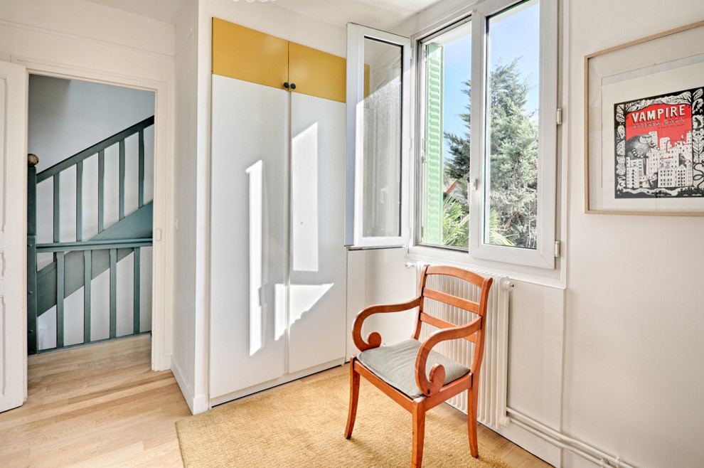 Après. Le bureau est désormais une pièce traversante dévolue au rangement. Le père de famille a créé des placards pour y stocker son matériel musical. Il se sert plutôt de la chambre d’amis lorsqu’il doit s’entraîner pour sa profession. Le placard sert également à cacher une partie de l’escalier des combles.