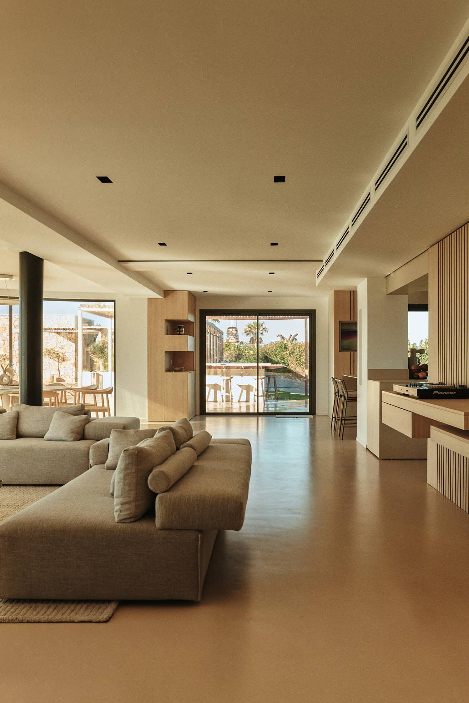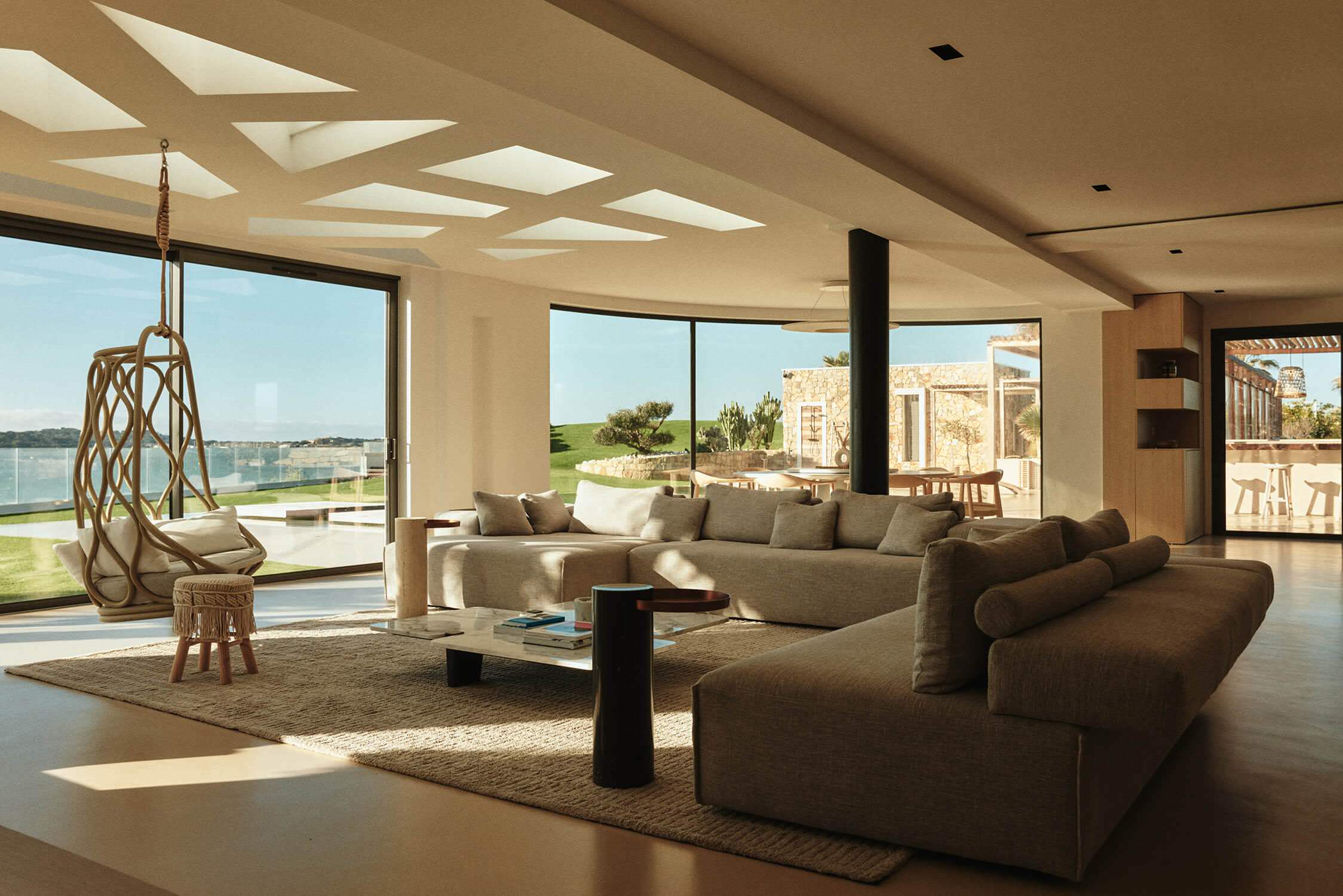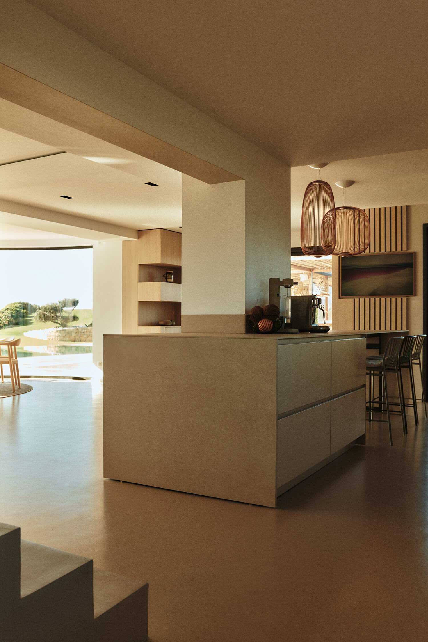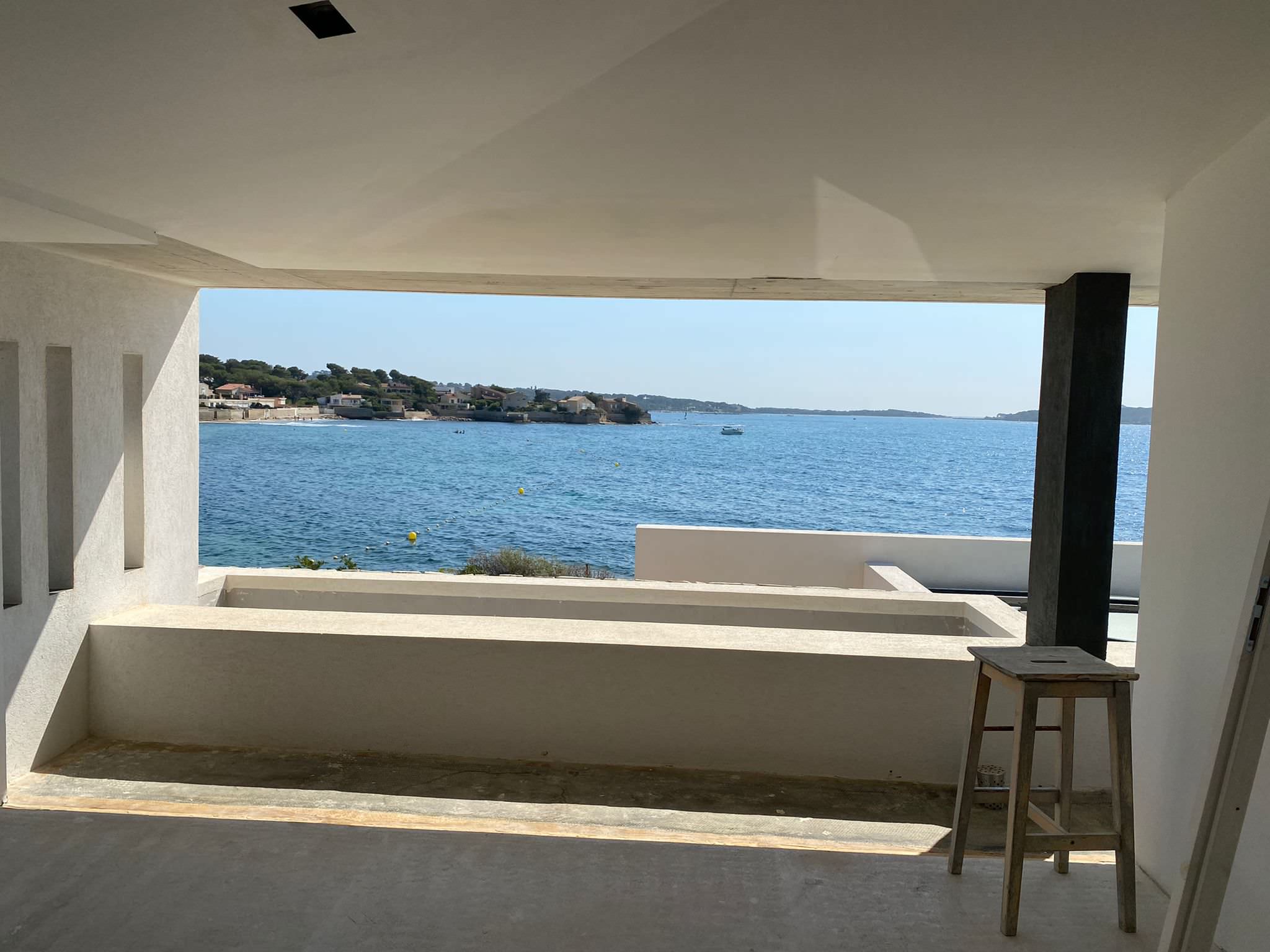 Nous entrons dans la maison principale par une porte qui se situe juste derrière la cuisine et découvrons une vaste pièce lumineuse tournée vers sa vue sublime sur la mer, à peine à quelques dizaines de mètres. Au sol, le béton ciré d’un beige chaud a été recommandé par les architectes d’intérieur afin de rénover avec un matériau unique intérieur et extérieur. « Nous avons privilégié le minimalisme, dans l’esprit que nous avions mis en œuvre dans la maison du propriétaire à Garches et qui lui plaît beaucoup », indique Kasia.