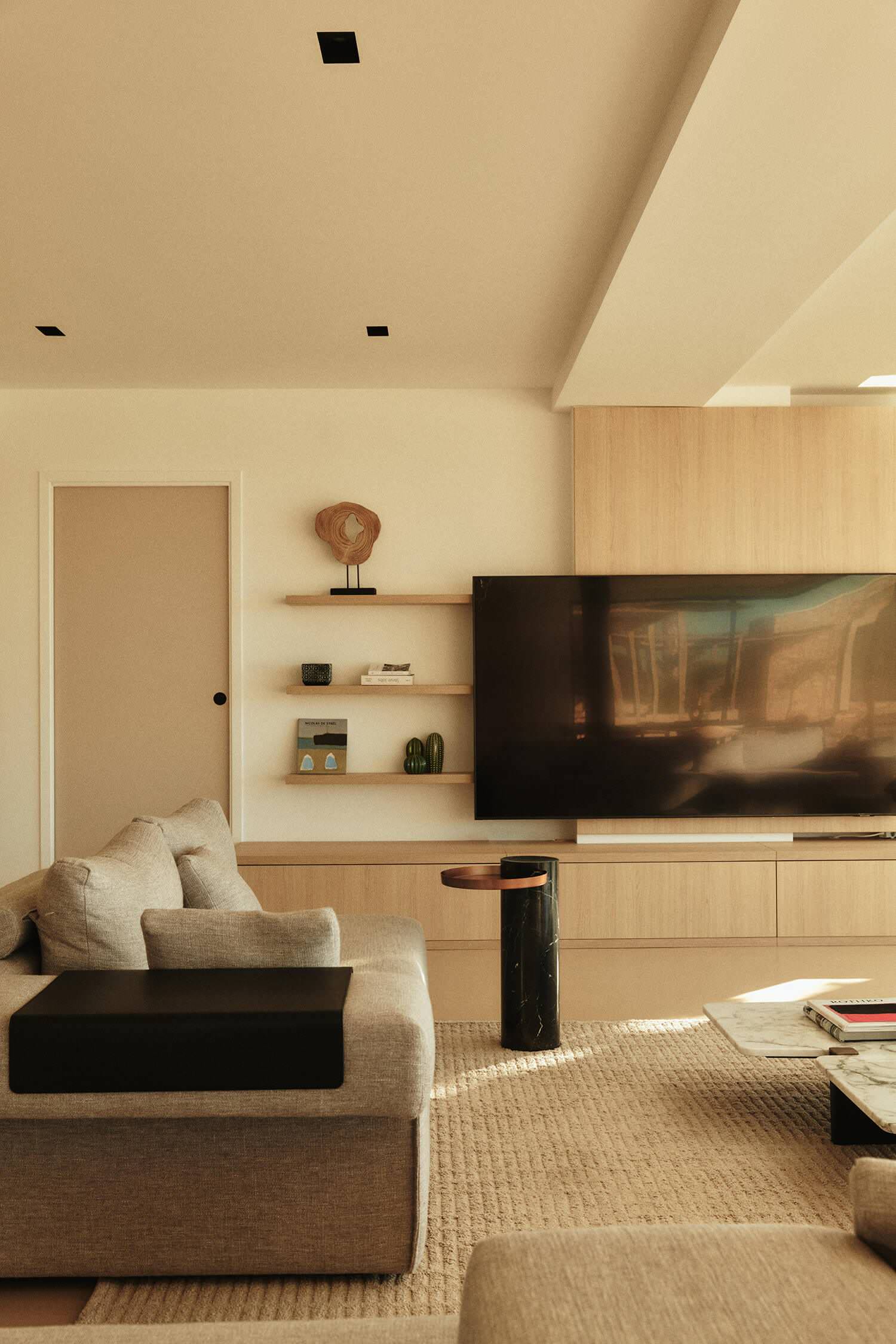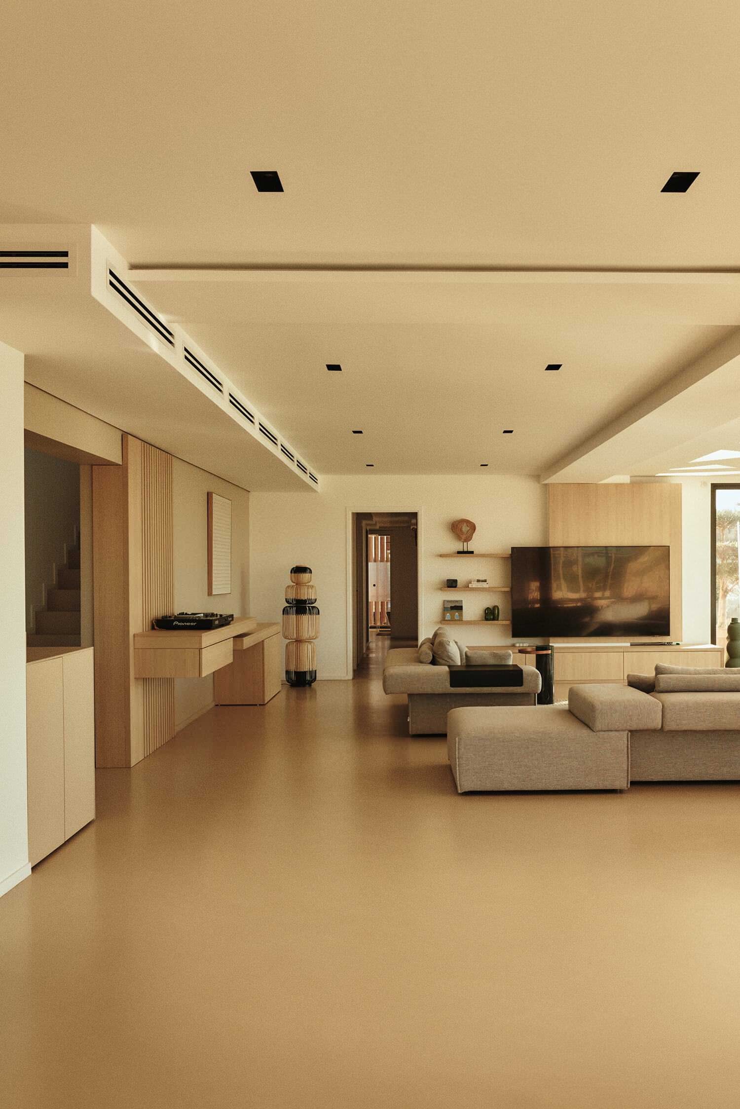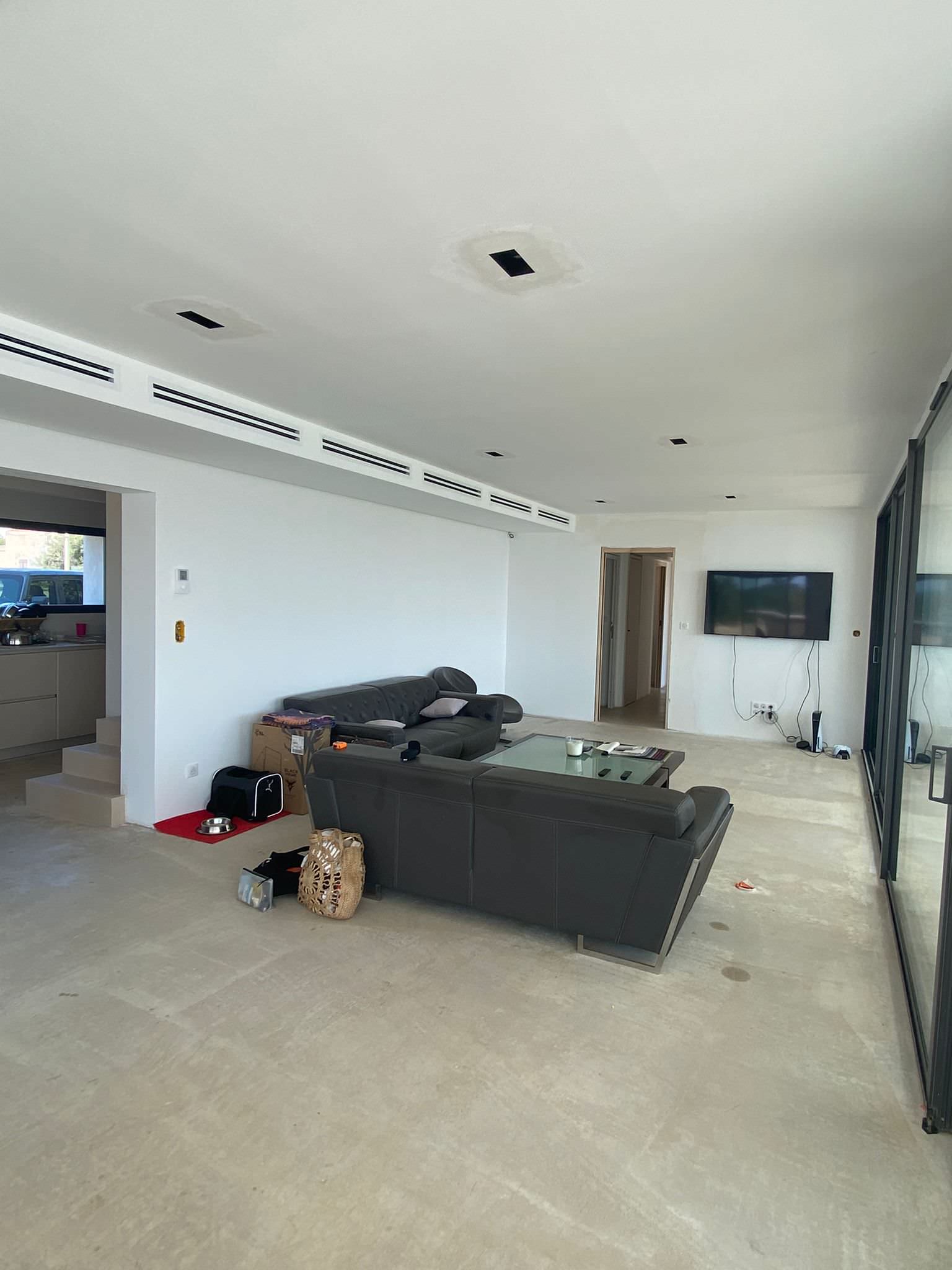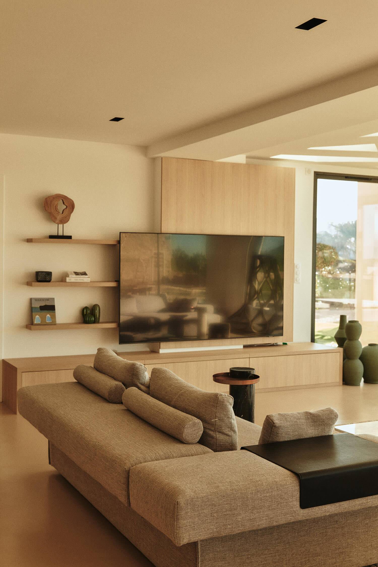 Après. Longeant la cuisine, nous arrivons au nouveau salon qui occupe la même place qu’auparavant. Toutefois, pour lui conférer plus d’ampleur, une extension a été réalisée vers la mer et les baies vitrées remaniées. Il y a désormais de la place pour que l’écran géant s’épanouisse à la droite de la porte qui mène à une première zone nuit, celle des enfants et amis. Même si les professionnelles auraient été partisanes d’un écran de taille plus limitée, « les enfants adorent cet écran XXL qu’ils ont choisis eux-mêmes », plaisante Kasia.