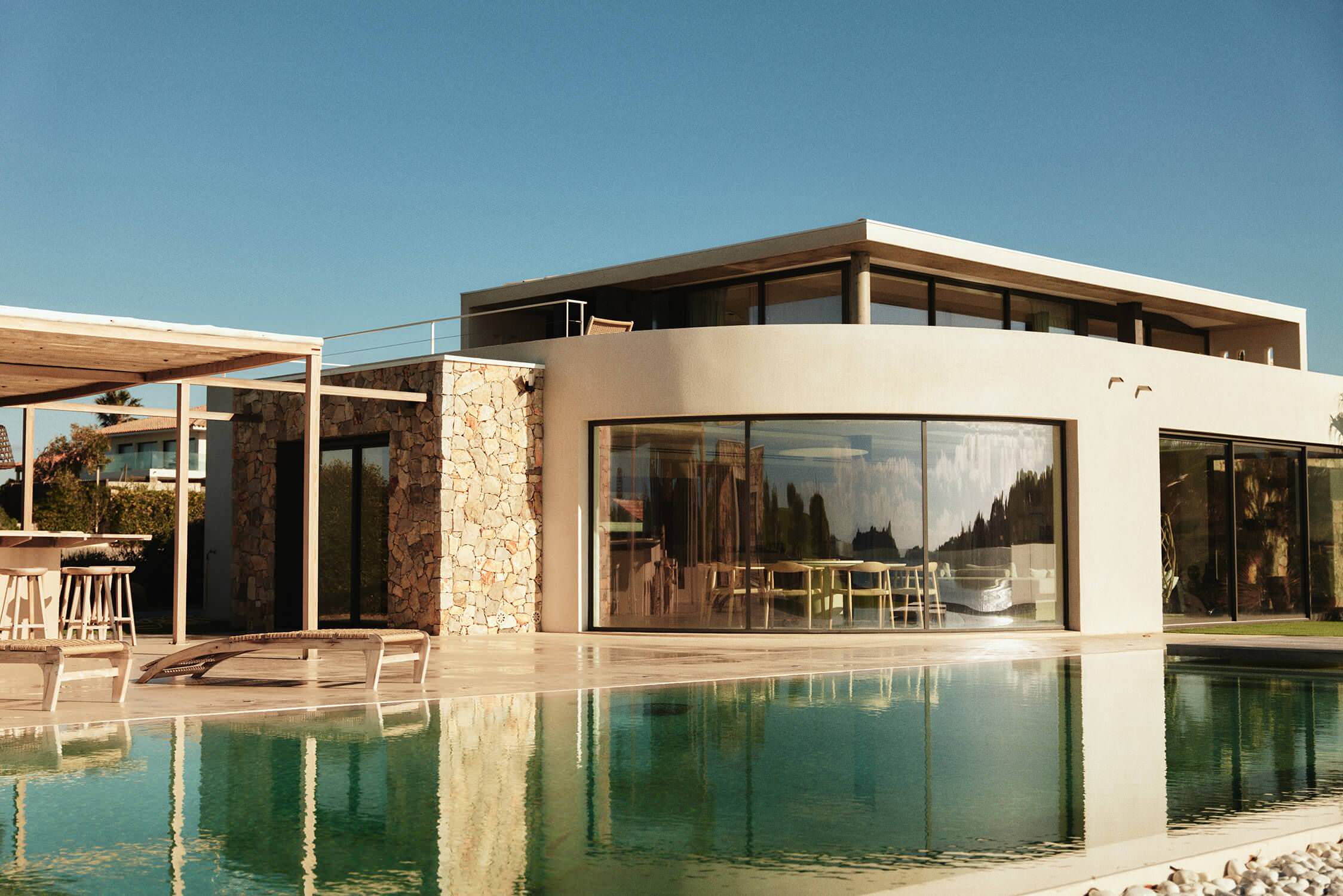 Derrière la pergola, le pool house existant a été recouvert d’un parement de pierres sèches, comme une ancienne bergerie, et transformé en studio de réception pour les amis.