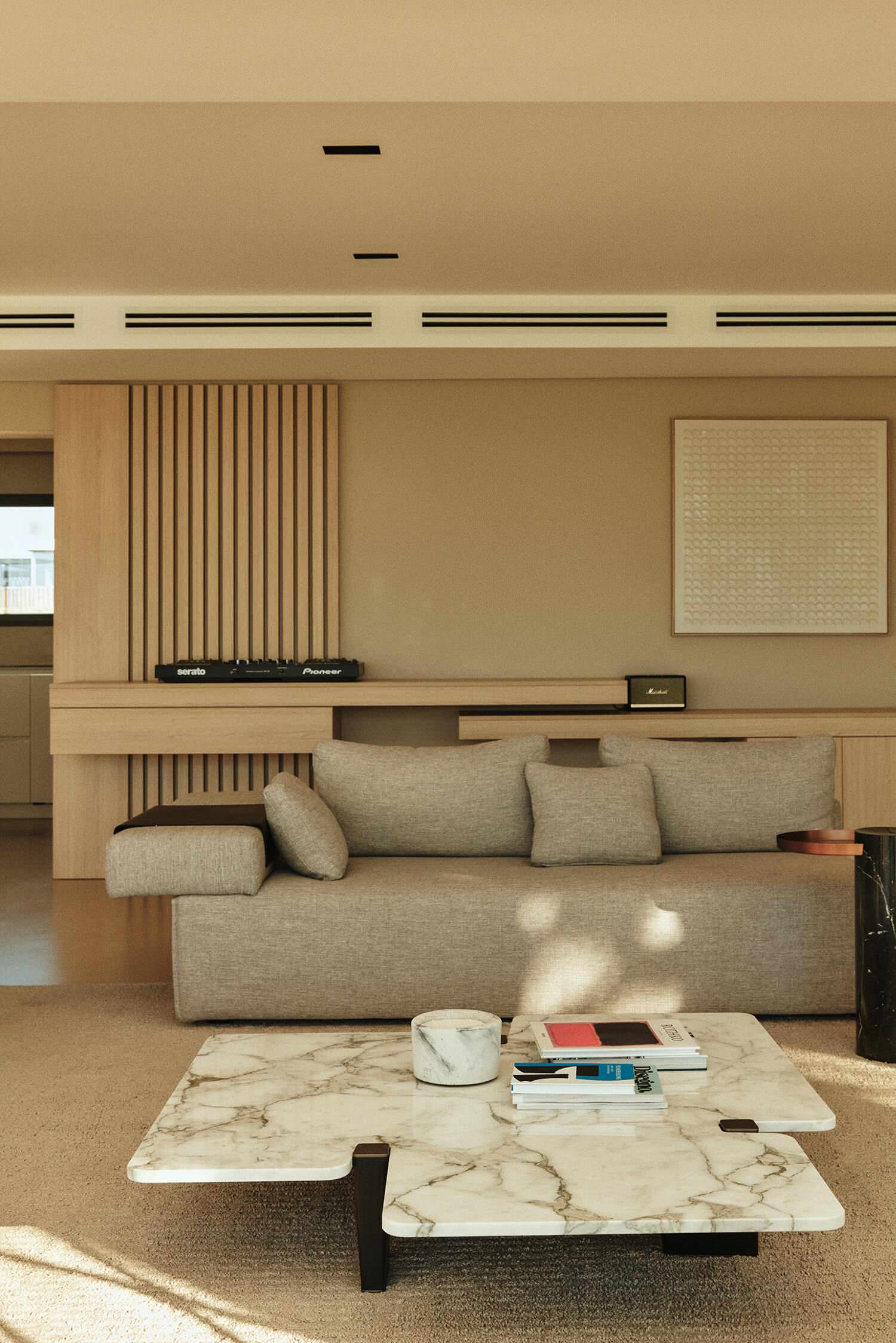 Le grand sofa modulable est facile à reconfigurer à l’envi en cas de réception. « On a tout pensé pour que l’on puisse improviser un déjeuner ici autour de la table basse ou retourner les fauteuils pour voir les DJ sets de notre client », partage Kasia, révélant les platines de cet aficionado de musique électronique installées à l’arrière des canapés.