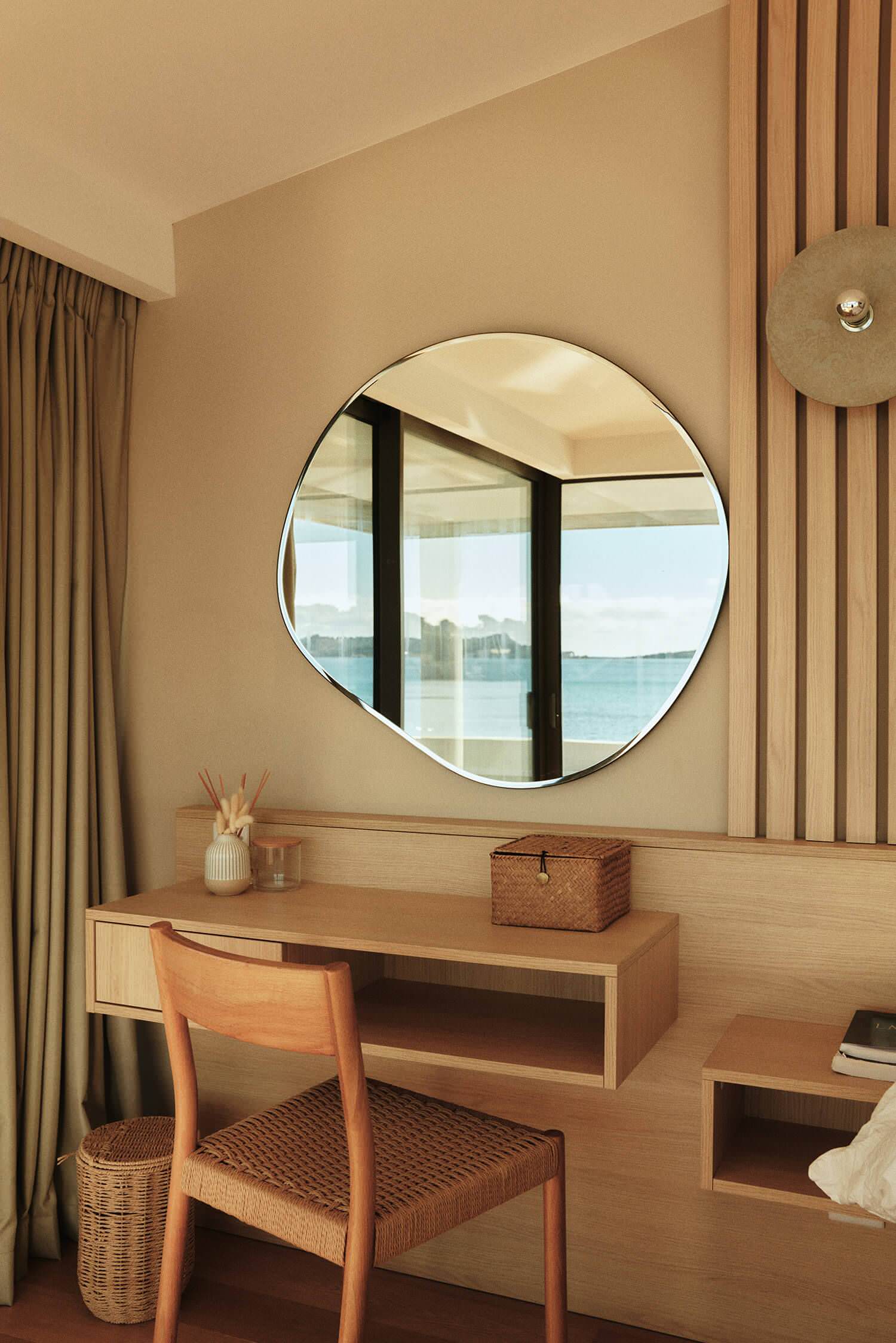 Le jeu de lignes observé à l’étage bas se poursuit dans la suite parentale à travers le jeu de tasseaux de la tête de lit et le plissé des rideaux occultants. Cette petite coiffeuse était la demande de la propriétaire.