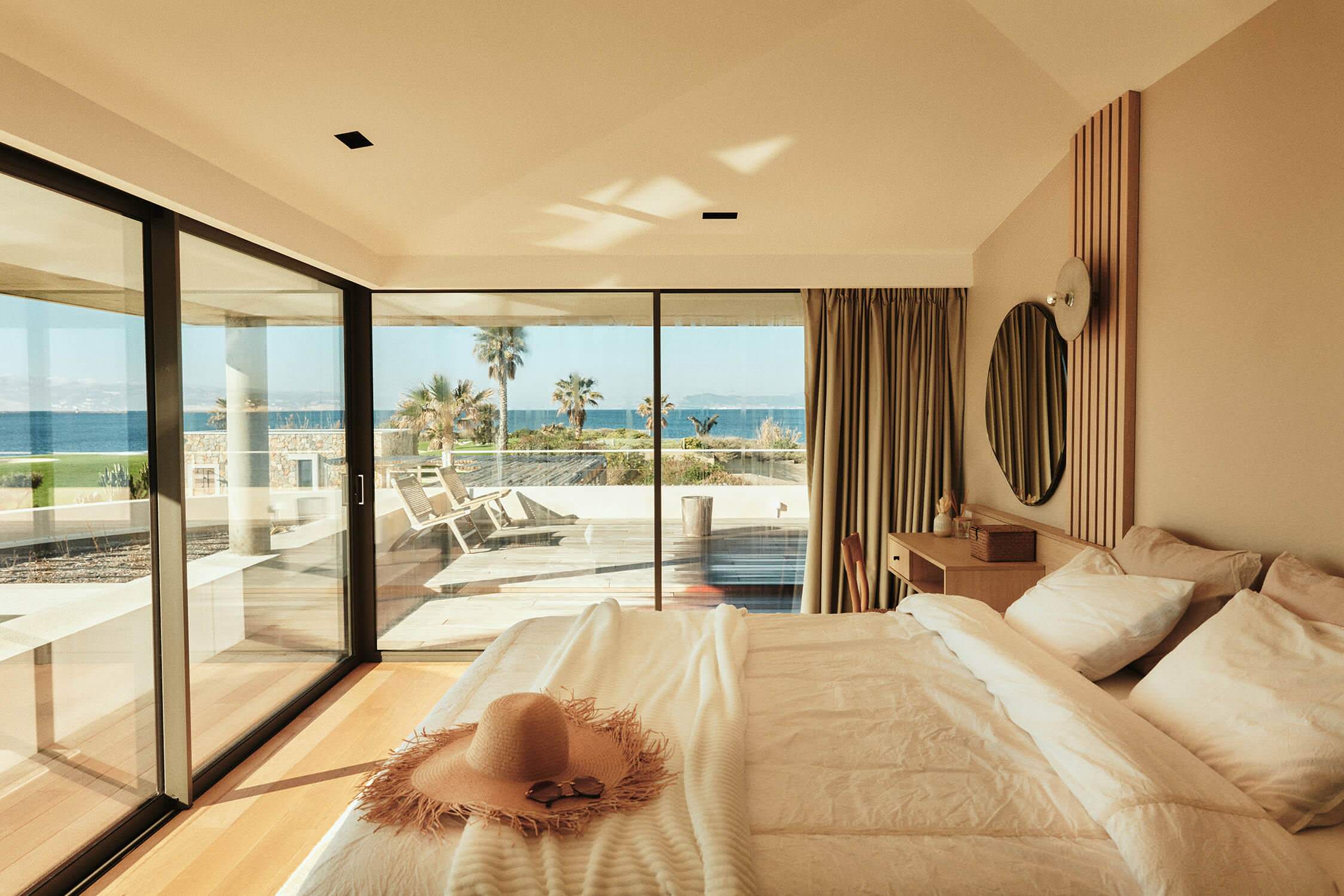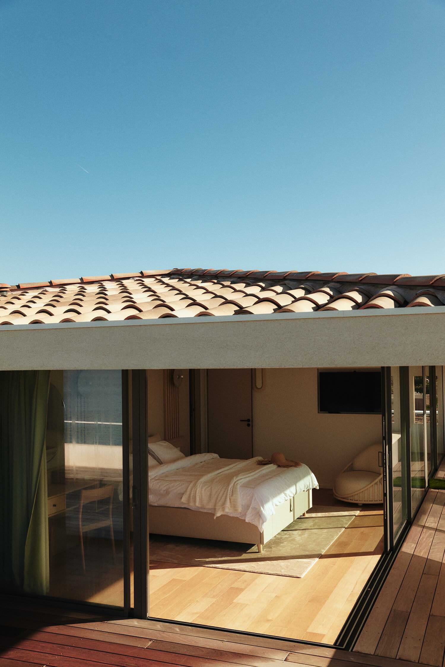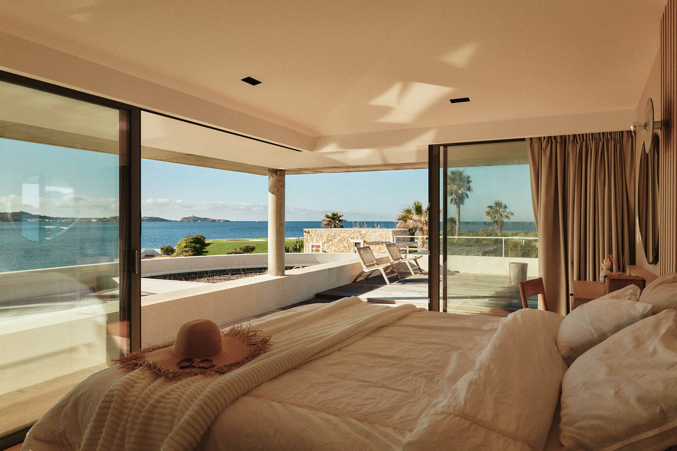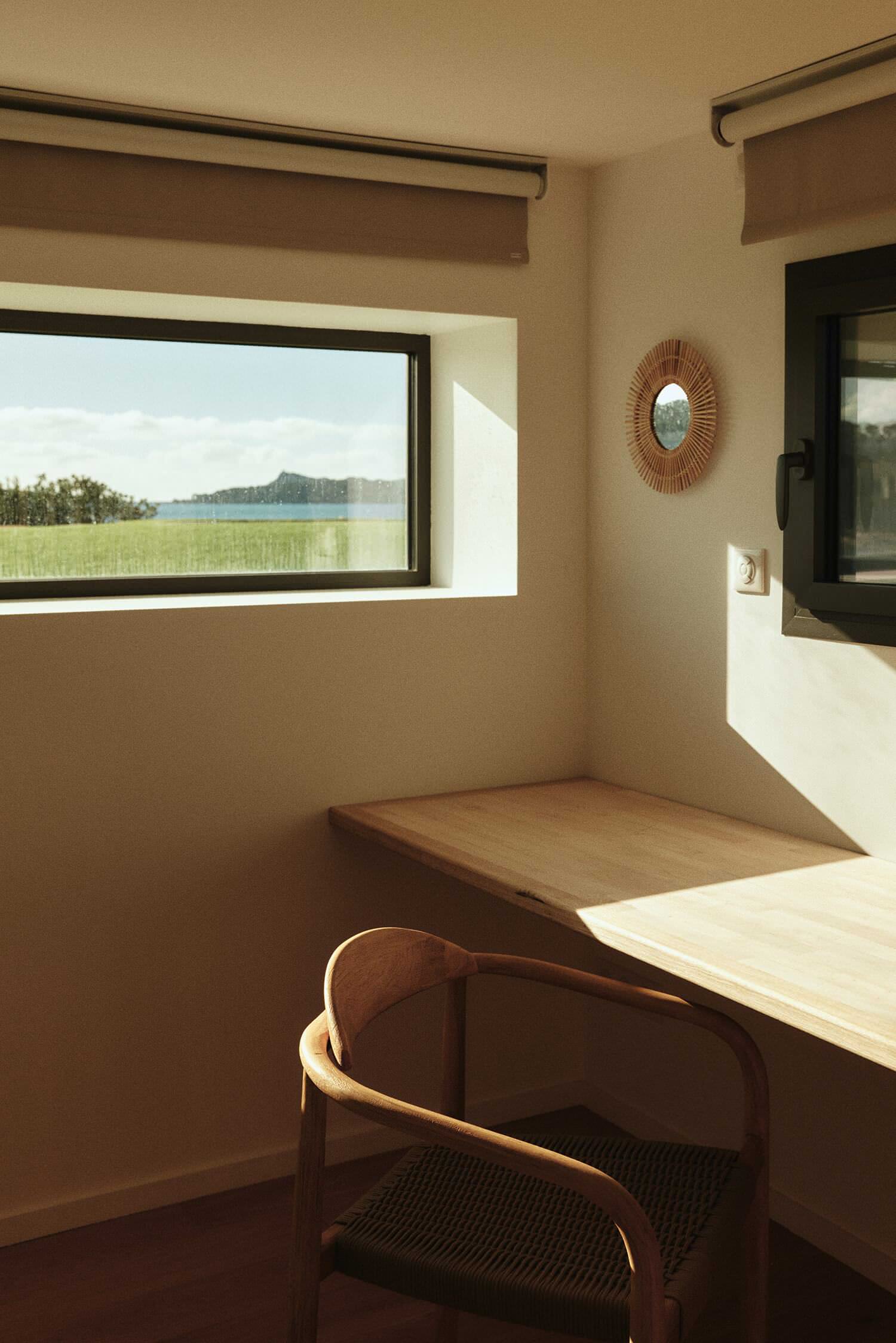 Dans la chambre parentale, simplicité et sobriété sont les maîtres mots. Le luxe réside dans la vue imprenable sur la mer, offerte par l’emplacement privilégié sur la pointe. La baie vitrée, dénuée de montant à l’angle de la pièce, offre un belvédère de choix sur l’horizon.