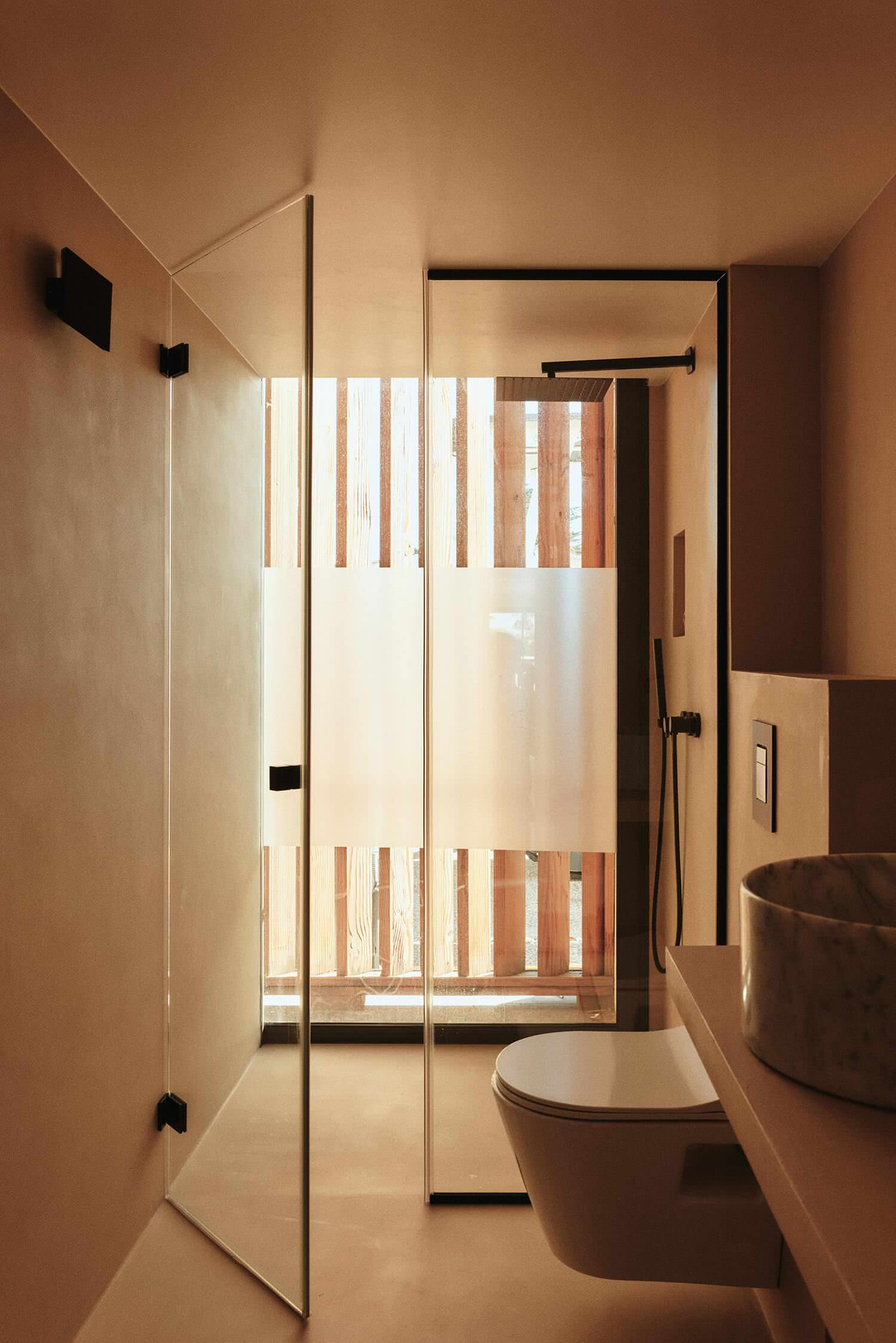 La salle de bains est dans la même ambiance douce et terreuse que tout le reste, avec un confort digne d’un palace : douche à l’italienne à la vue sur jardin tamisée par un claustra, toilettes et plan vasque en béton ciré suspendus.