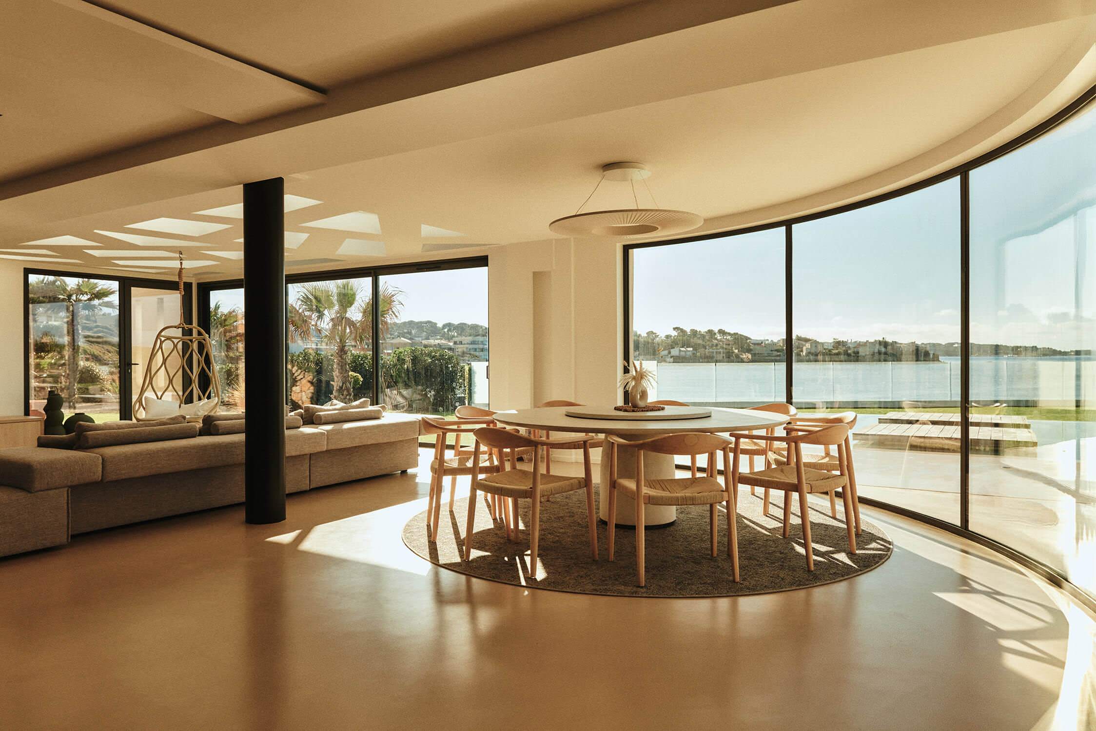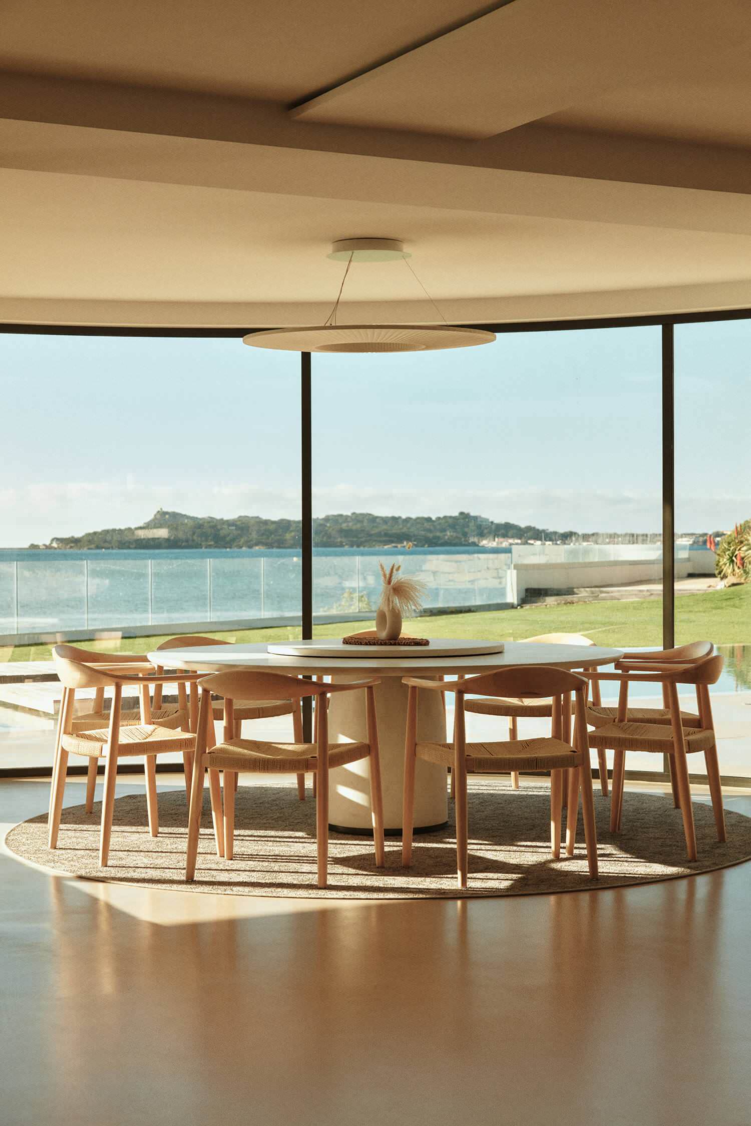 Lorsque la vue sur la mer est aussi magique qu’à travers cette somptueuse baie vitrée arrondie, il n’est pas nécessaire de jouer l’exubérance dans la décoration intérieure afin de lui laisser la part belle. Aussi le minimalisme a été privilégié, avec cette table ronde de 2,20 mètres de diamètre aux formes pures pouvant accueillir jusqu’à dix convives, complétée par les chaises Wishbone, des icônes du design aux dossiers délicatement cintrés et l’éclairage chaleureux de la suspension également arrondie. « Pour accompagner cet interprétation sur le thème du rond, la table en travertin est munie d’un plateau central tournant », note Kasia.