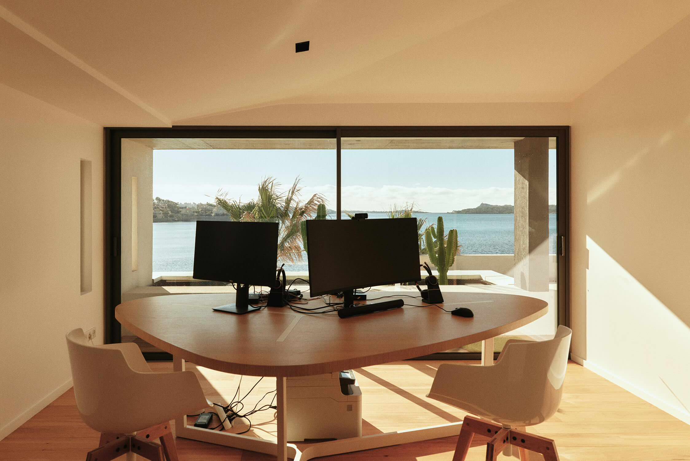 Quant à Monsieur, il a expressément exigé que cette pièce, attenante à la chambre, soit destinée au télétravail. La table de travail a été conçue sur mesure dans une forme triangulaire très graphique. Grâce à la grande baie en bandeau, les deux postes de travail profitent d’une vue inspirante.