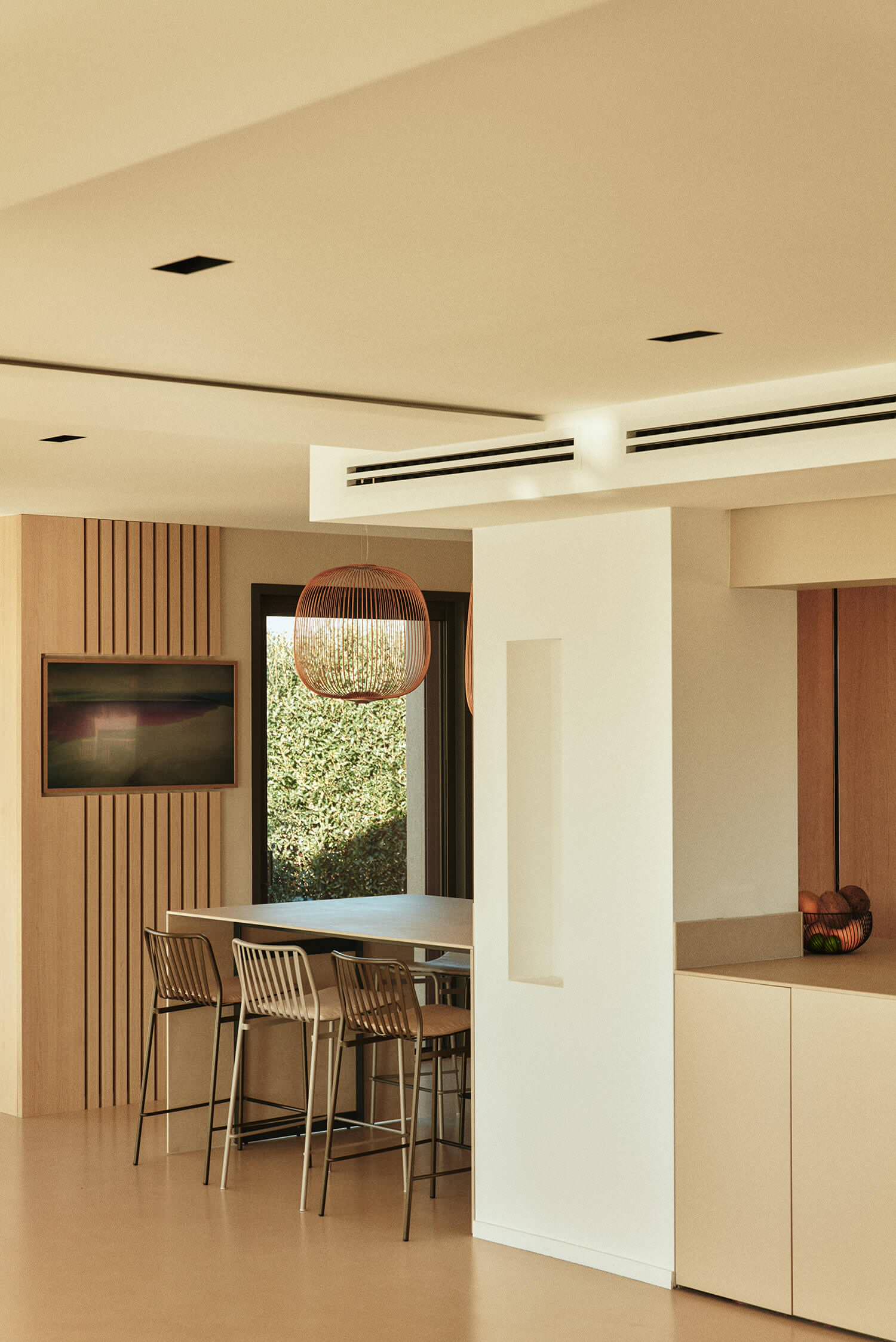 Pour que les bouches de la climatisation existante s’intègrent au mieux, un jeu de lignes a été étendu à tout l’espace. « Nous avons choisi la suspension qui éclaire le coin repas en forme de cage à oiseaux dorée », note en particulier Kasia.