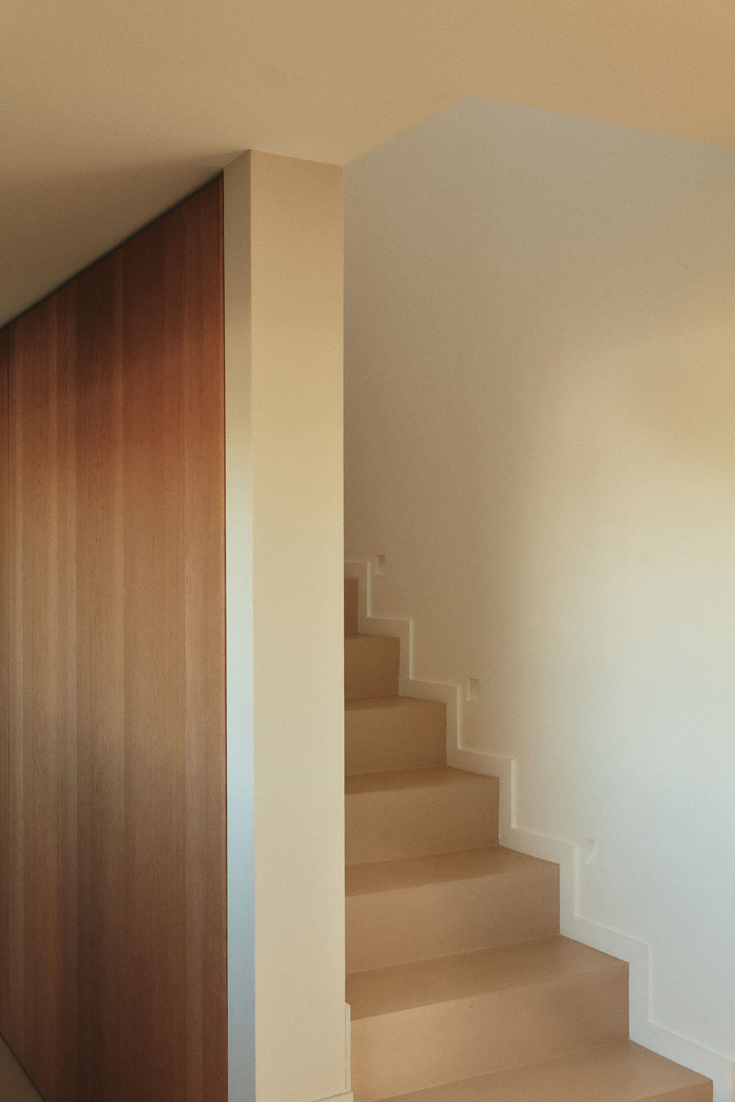 Derrière la cuisine, cette discrète montée aux marches recouvertes de chêne conduit directement à l’espace parental que nous visiterons un peu plus tard.