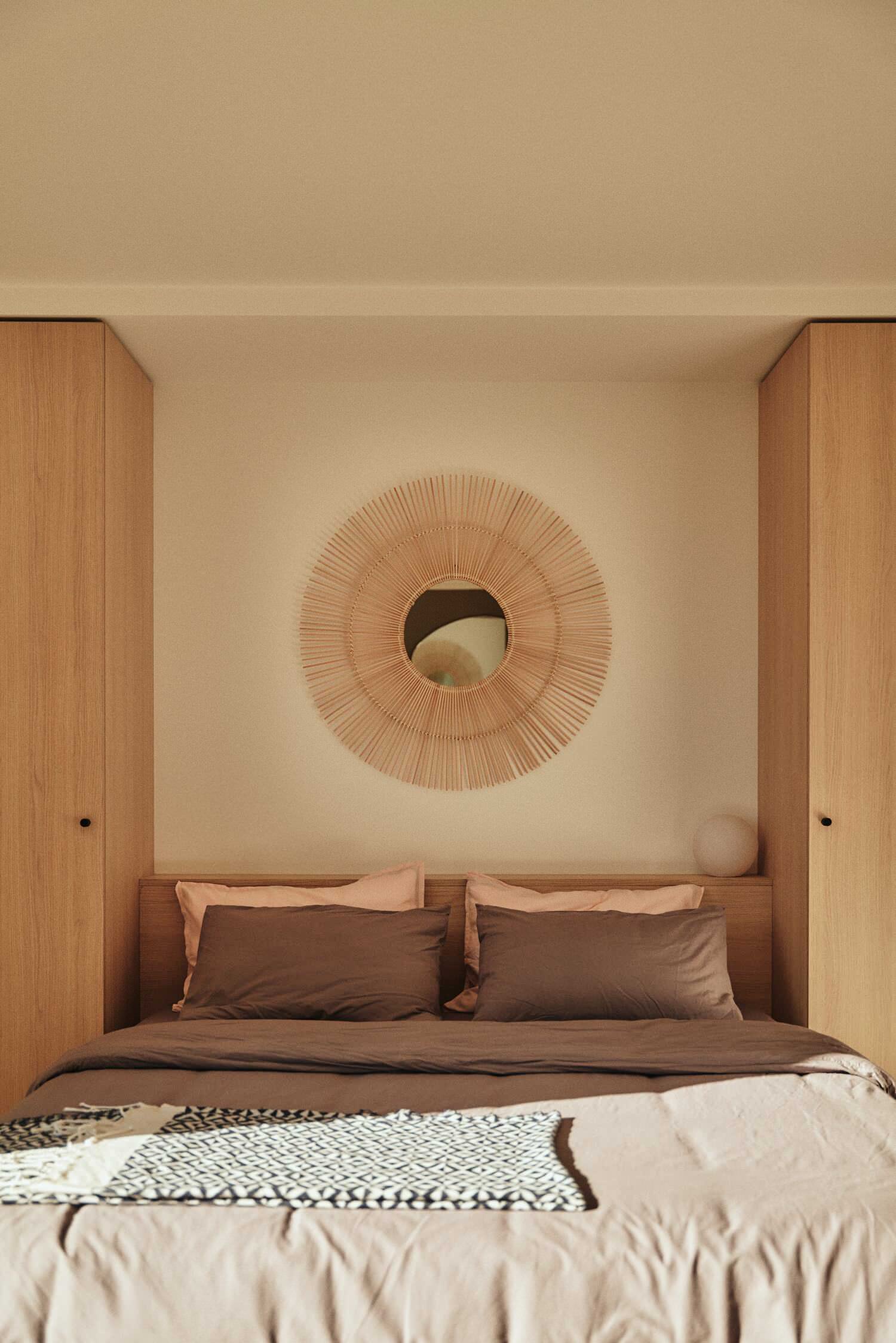 Néanmoins, la palette douce allant du crème au beige, en passant par le bois, les fibres naturelles et le marron, a été également distillée ici aussi. On retrouve même le motif à claire-voie des tasseaux de bois qui sont venus revêtir l’ancien garde-corps.