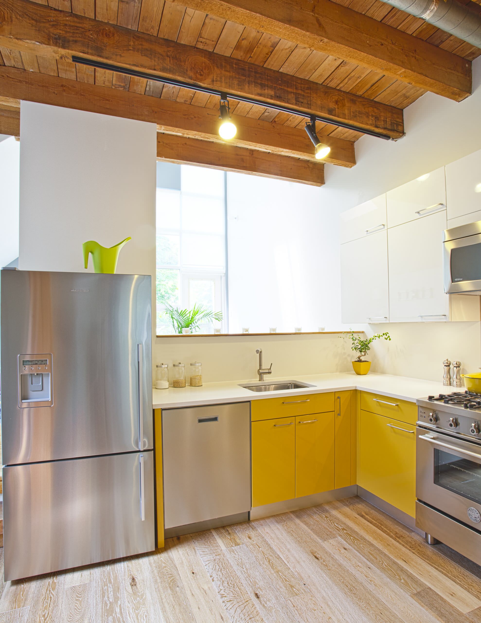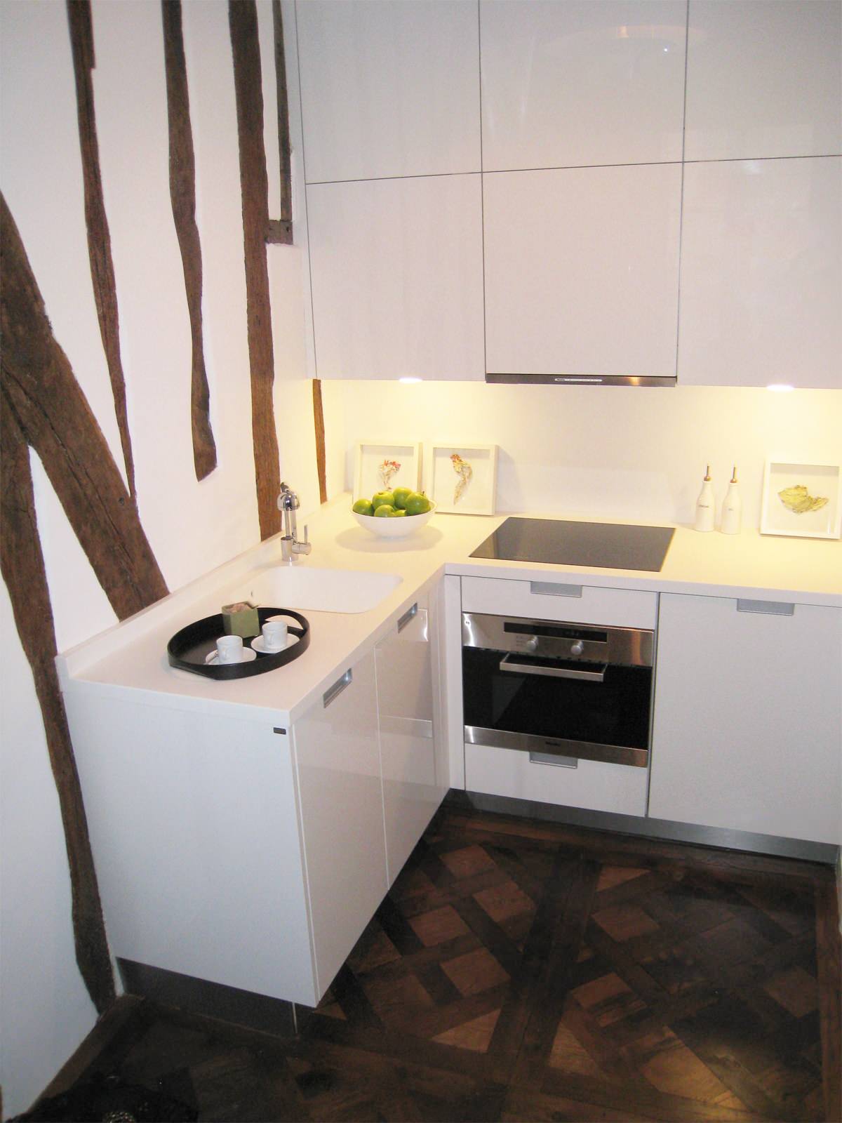 1. Elle sait s’adapter, avec beaucoup d’élégance, aux petits espaces. Pour cela, vous devrez faire appel à un professionnel qui saura optimiser au mieux l’espace que vous pouvez lui accorder. N’ayez pas peur de marier une cuisine très contemporaine à un espace plus traditionnel. Au contraire, le contemporain met en valeur vos matériaux anciens, comme ici, les poutres et le sol.