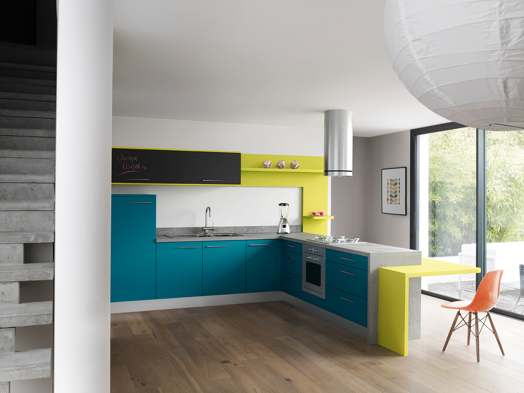 Si vous choisissez une cuisine très colorée, pensez qu’il faudra retrouver des rappels des couleurs dans le reste de la pièce. Ici un pan de mur est travaillé dans la même teinte que le plan de travail, les placards noirs font écho à l’encadrement de la baie vitrée, et on peut supposer que de petits objets (vases, coussins, tableaux… ) répondent au bleu et au jaune de la cuisine.