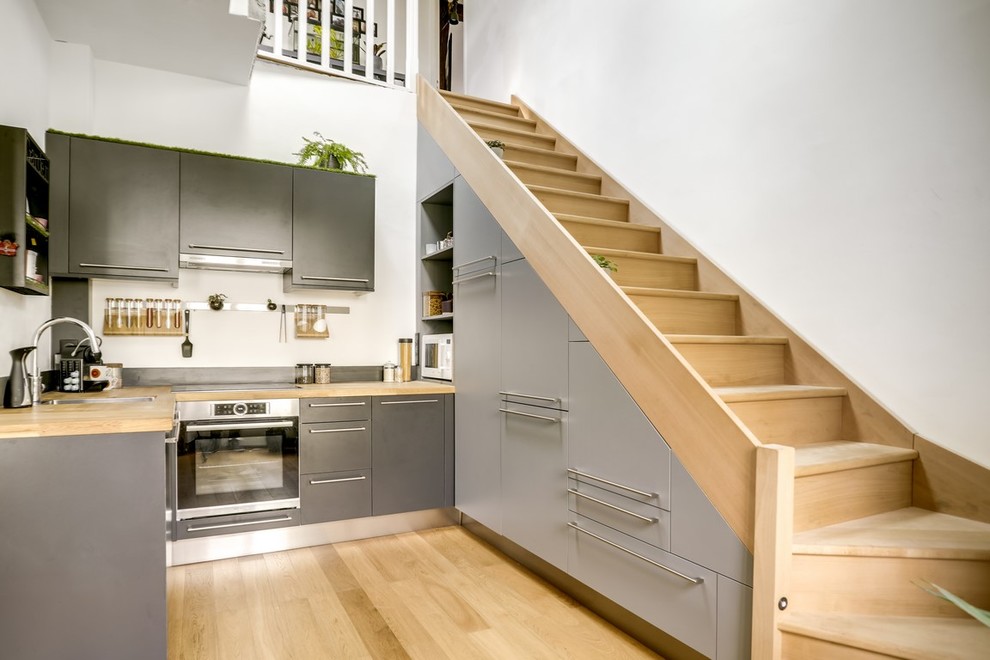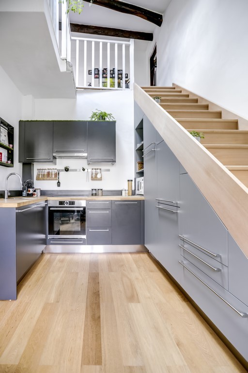 À noter, nous avons fait économiser à notre client au moins 1500 euros en étudiant bien ses besoins. Il tenait à avoir des meubles toute hauteur pour une question de design, mais sans réel besoin de rangement, d’ailleurs fort peu pratique sous le plafond. Nos poseurs, ébénistes, ont réalisé sur mesure des retombées en panneaux de bois.