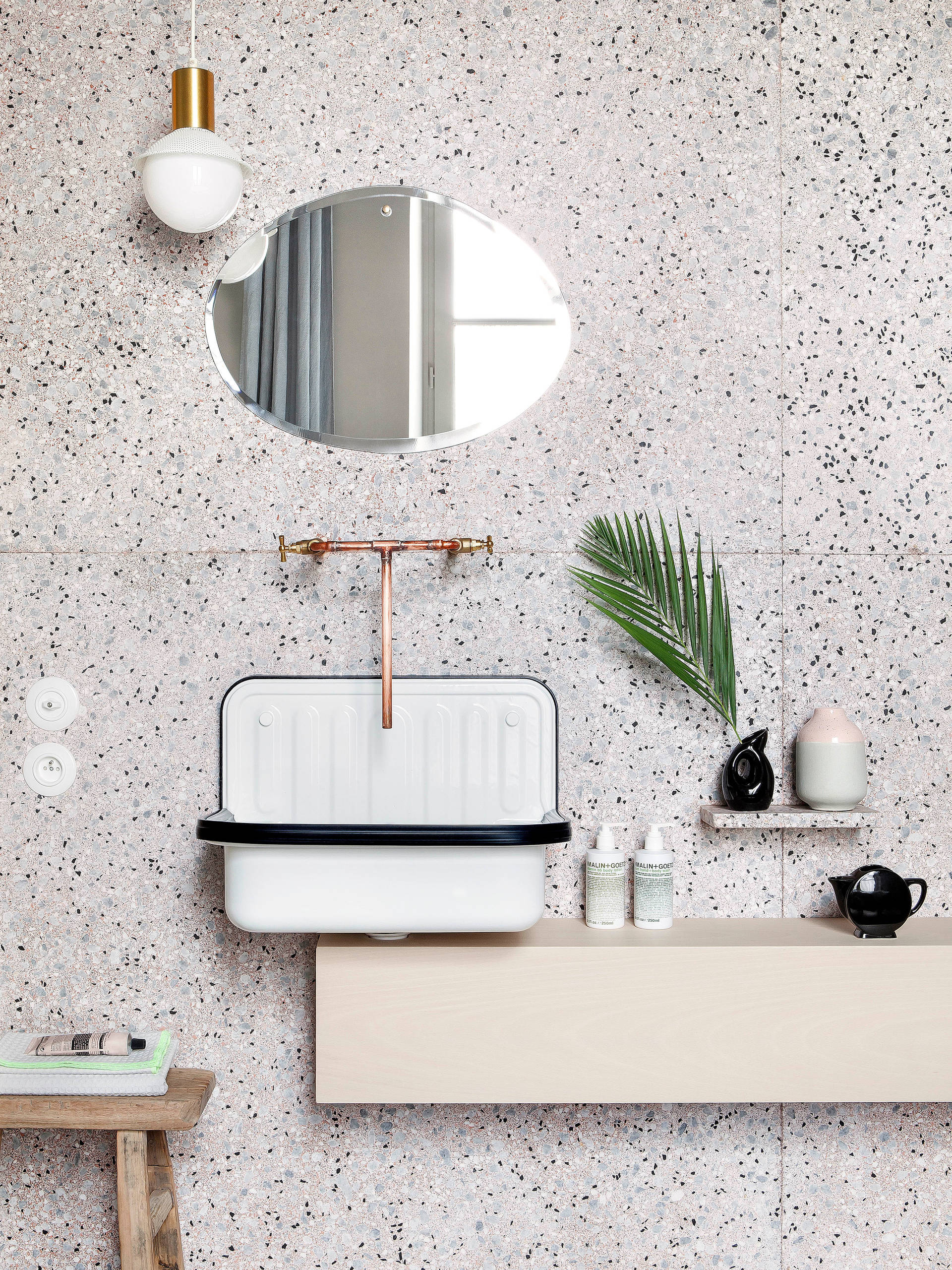 Le charme du terrazzo provient de l’irrégularité des d’éclats de pierres, de marbre et de verre qui le caractérise. Principalement utilisé en revêtement de sol, car il est à la fois solide et facile d’entretien, il se décline aujourd’hui en carrelage trompe-l’œil et envahit les murs pour devenir un élément décoratif à part entière.