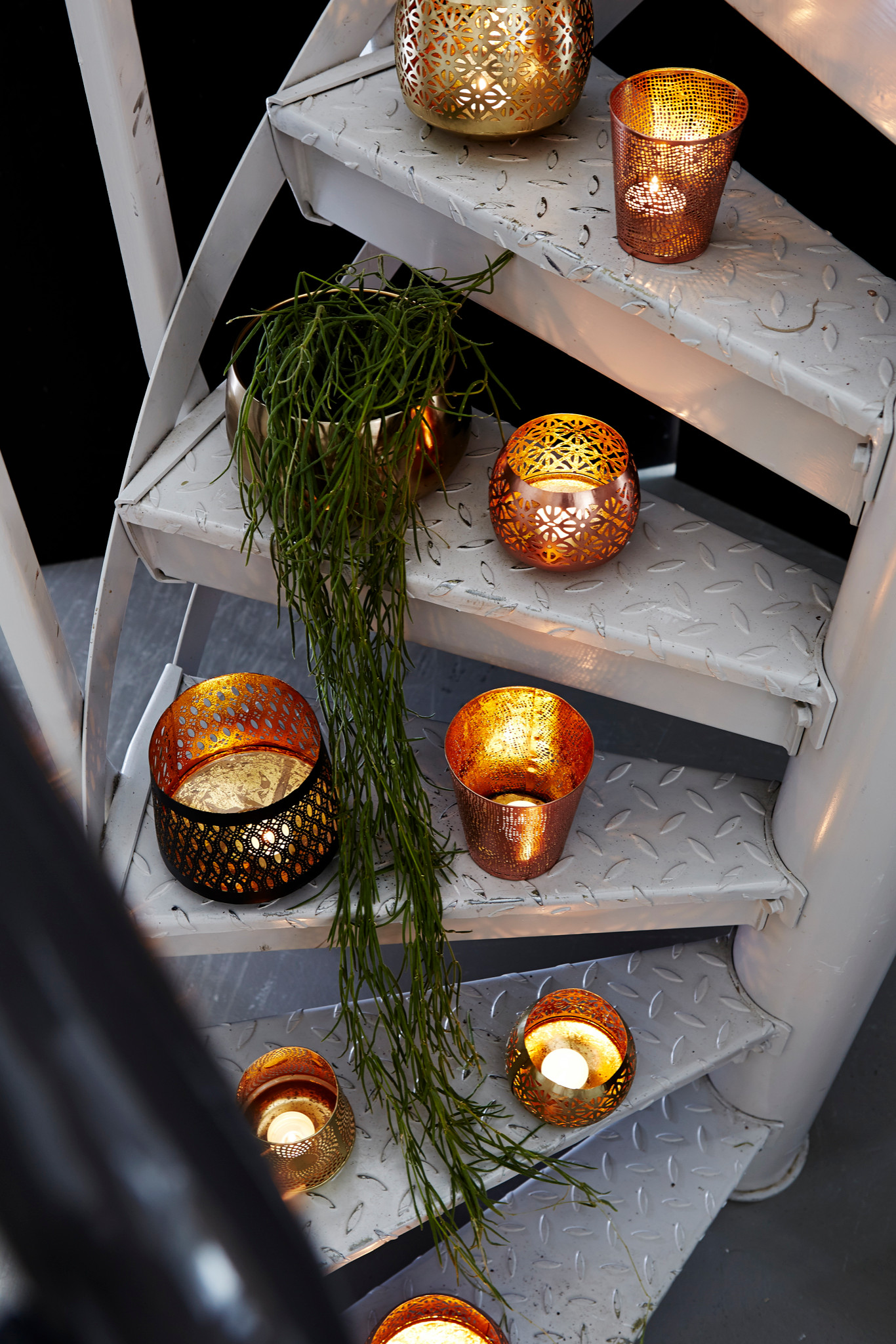 Seconde option : les disposer sur les marches basses ou tournantes de l’escalier. Retenez cette autre idée : alternez verdure et flammes. Votre escalier de style industriel en métal s’en trouve réchauffé, comme par magie ! Jouez sur les contrastes comme ici, des lanternes en métal noir sur un escalier blanc.