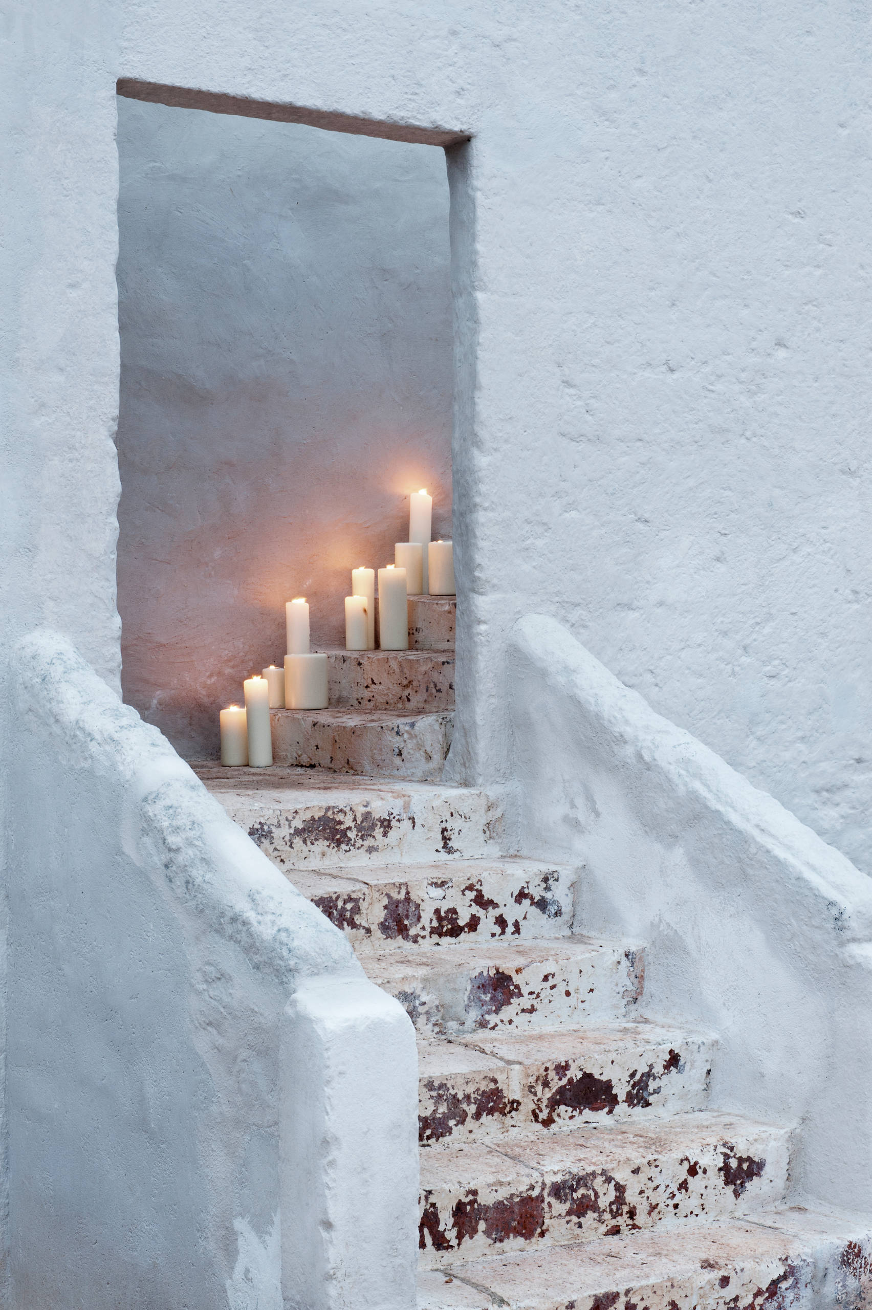 Un escalier en pierres ou en briques, c’est généralement froid. Et s’il est tournant, la lumière vient à manquer au bout de quelques marches. Inspirez-vous de cette bien jolie idée décorative : réunissez un régiment de bougies assorties et divisez-les en groupes de trois sur chaque marche. N’oubliez pas de déstructurer un peu l’ensemble en associant des tailles ou diamètres différents. Le résultat est intemporel et romantique.