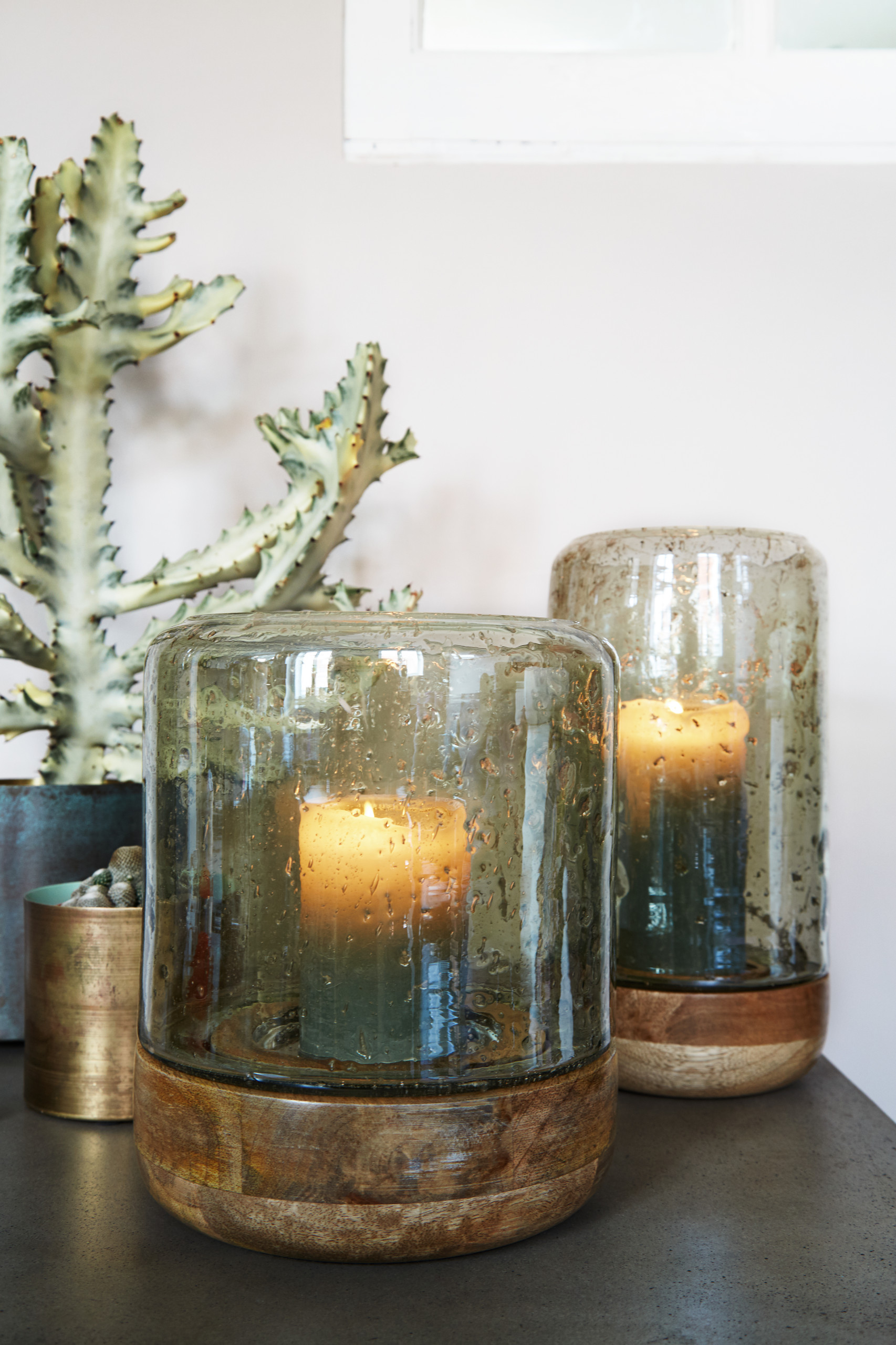 L’illusion d’une bougie qui manque d’oxygène, embuant la vitre où elle est emprisonnée, est obtenue par l’utilisation d’un verre bullé. Ce style de verre épais était très utilisé, au quotidien, dans les années 70. Il revient en vogue, accompagné ici d’un cactus pour un effet supplémentaire, d’esprit jungle. N’essayez pas de retourner un verre à boire, s’il n’est pas perforé. Sinon, votre bougie s’étouffera pour de bon !