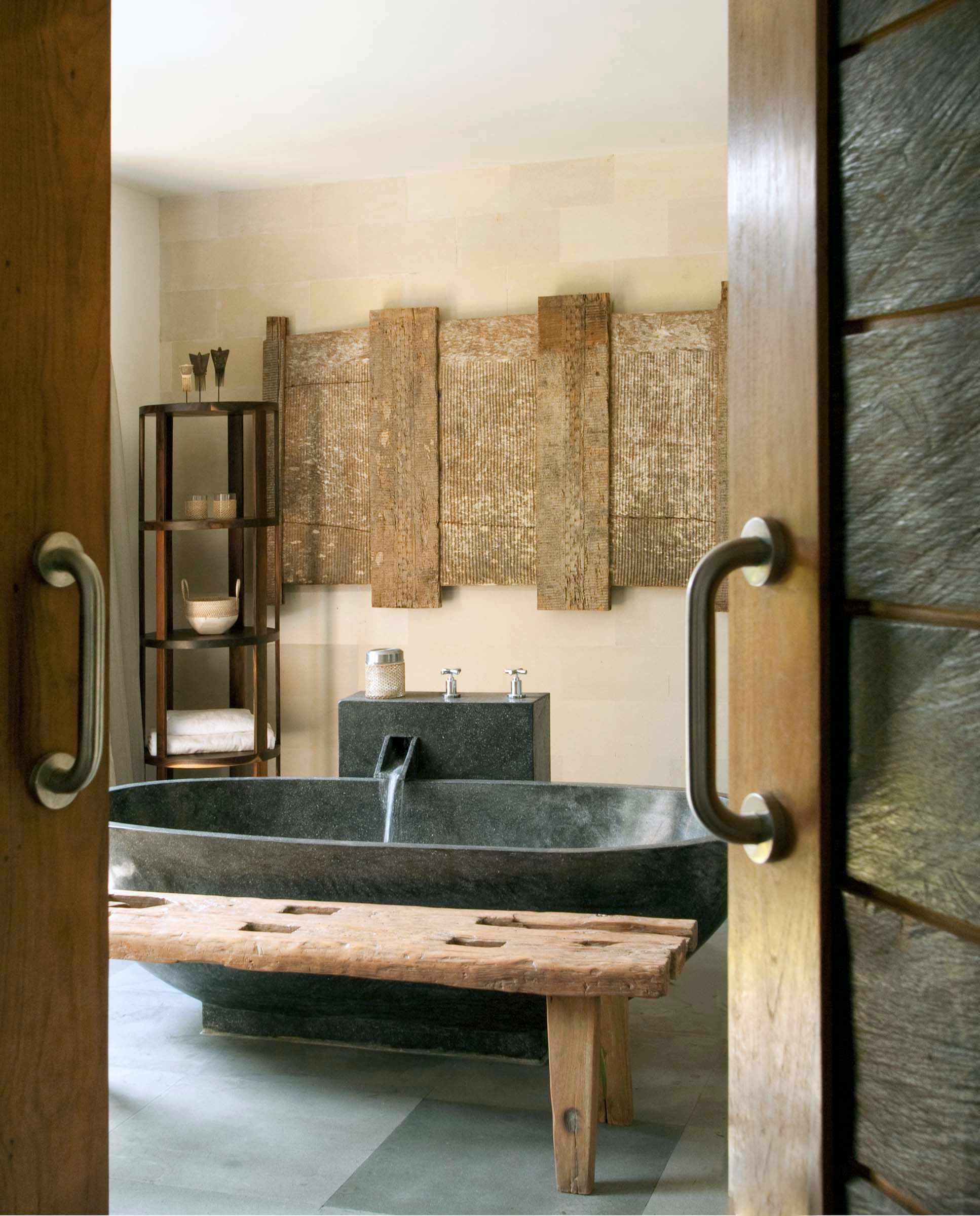 Les imperfections de la nature, ses irrégularités, contribuent grandement à son charme. Quand imperfection rime avec harmonie, on retrouve des meubles en matière brute et aux formes irrégulières comme cette baignoire, très wabi. Et puis on n’oublie pas de vieux meubles, sièges, échelles en bois en guise de repose-serviettes, quelques tiges de fleurs éphémères pour le côté sabi. La vue imprenable sur le vieil olivier est en bonus.