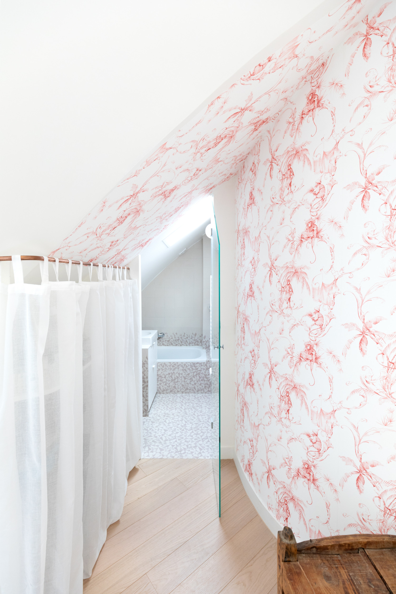 Derrière la salle de bains, le coin buanderie abritant un lave-linge et un cumulus a été intégré en sous-pente. Camouflé par un rideau blanc, cet espace se fond dans le décor, mis en valeur par un papier peint poétique aux tons doux inspiré des toiles de Jouy d’antan.