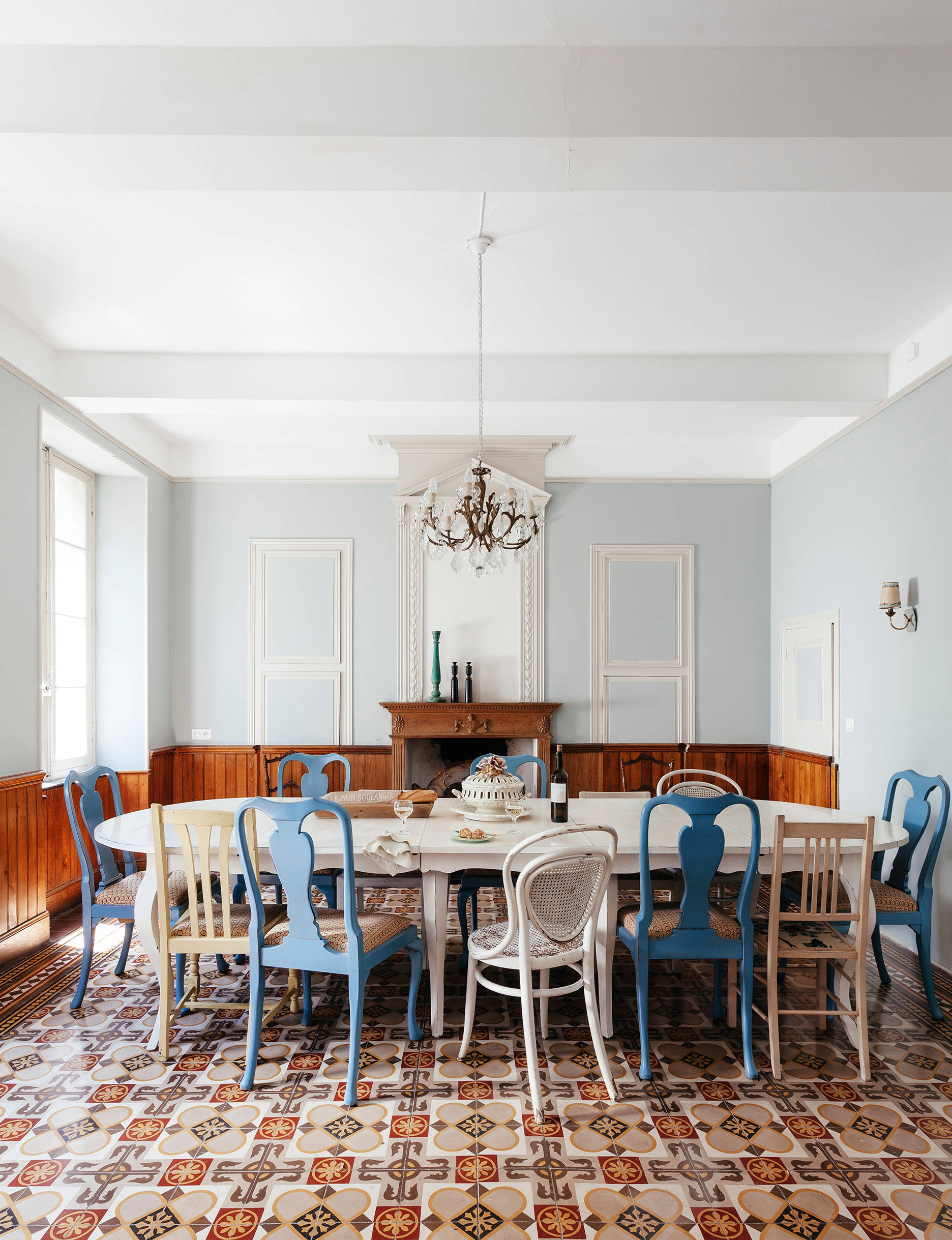 Jouez la carte du dépareillé permet aussi de réveiller un espace un peu classique. La preuve avec cette jolie salle à manger où un même code couleur (celui du style gustavien) vient souligner l’esprit du lieu. Ces chaises rembourrées et cannées peintes en bleu, beige et blanc subliment le sol omniprésent.
