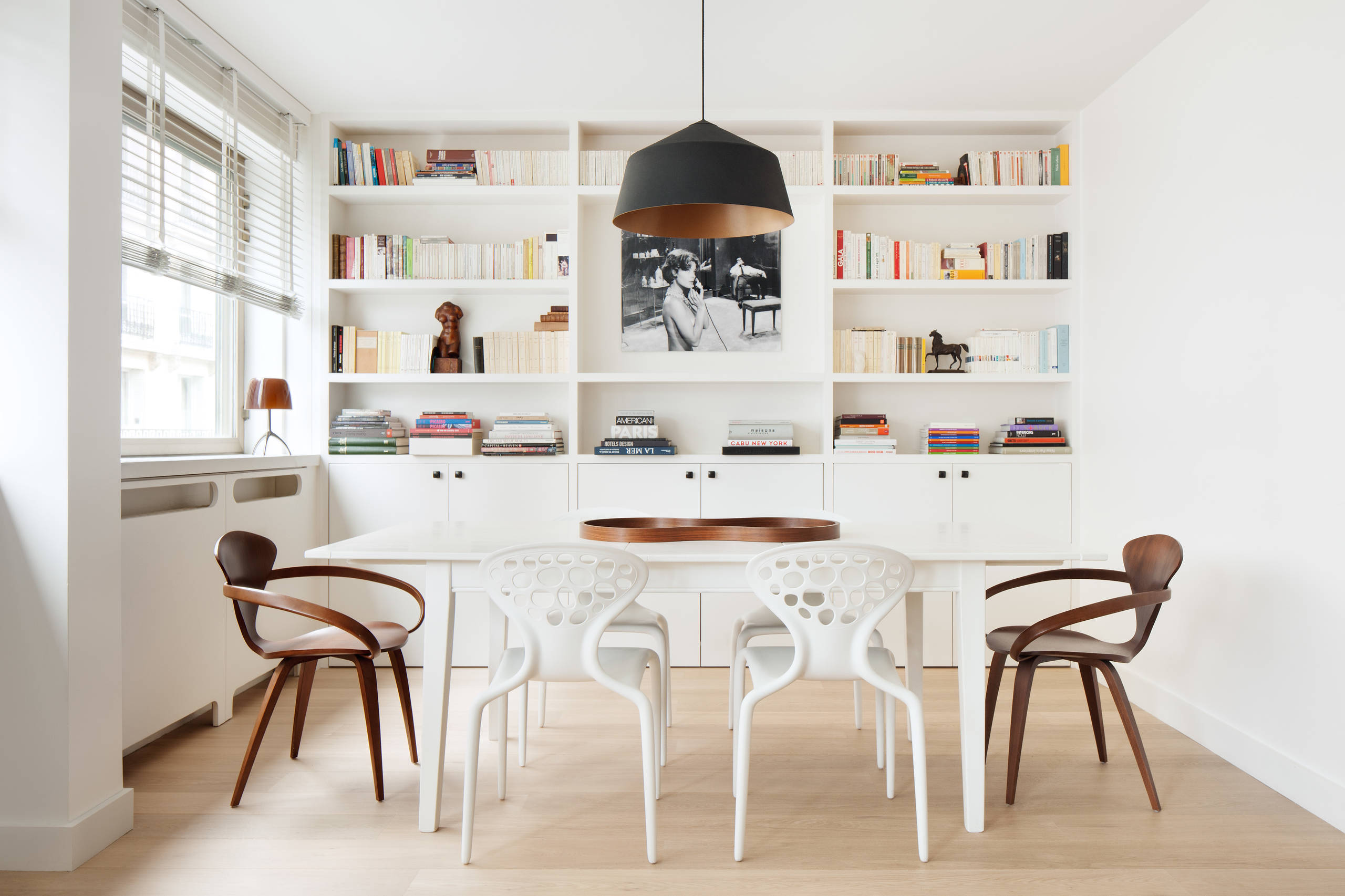 Cette salle à manger immaculée et très structurée fait la part belle à la symétrie. Étagères de rangement, table, chaises et luminaires, tout est dans un axe parfait. Pour réveiller cette belle harmonie sans pour autant surcharger l’espace, l’architecte a choisi de mêler deux chaises en bois au reste du mobilier épuré. Une bien belle idée pour recentrer le regard sur la table.