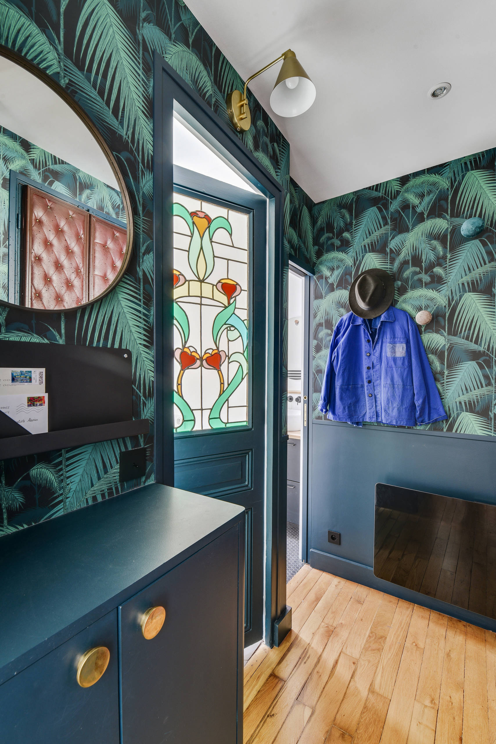 C’est l’exemple le plus commun qui pourtant charme toujours dès l’entrée des maisons anglaises ou encore belges. L’idée, lorsque le vitrail est préexistant à l’achat de sa maison, est de le moderniser en l’entourant d’un autre papier peint, d’une autre peinture de porte plus trendy, comme ici.