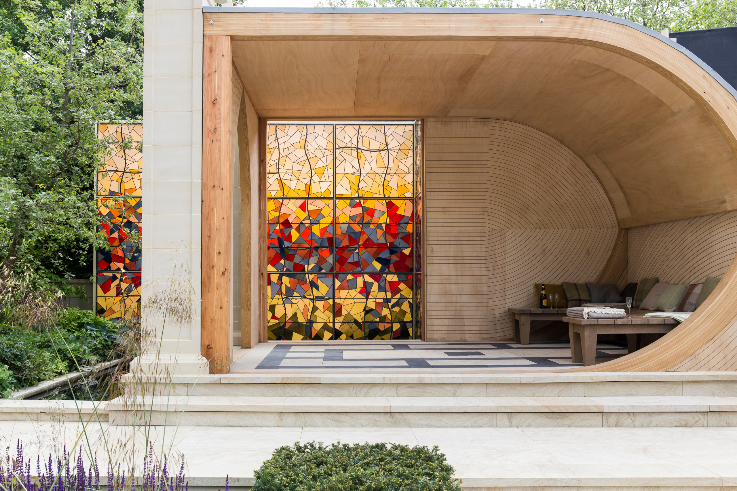 Si toutes ces belles idées précédentes de vitraux étaient admirées de l’intérieur, n’oubliez pas qu’un vitrail peut aussi s’admirer de l’extérieur. Parfois, c’est la lumière naturelle qui entre, parfois, c’est la lumière artificielle de la demeure qui met en valeur le vitrail de l’extérieur. Ou encore, le vitrail devient un filtre arty de la lumière naturelle, totalement en extérieur, comme dans cette « pièce de jardin ».