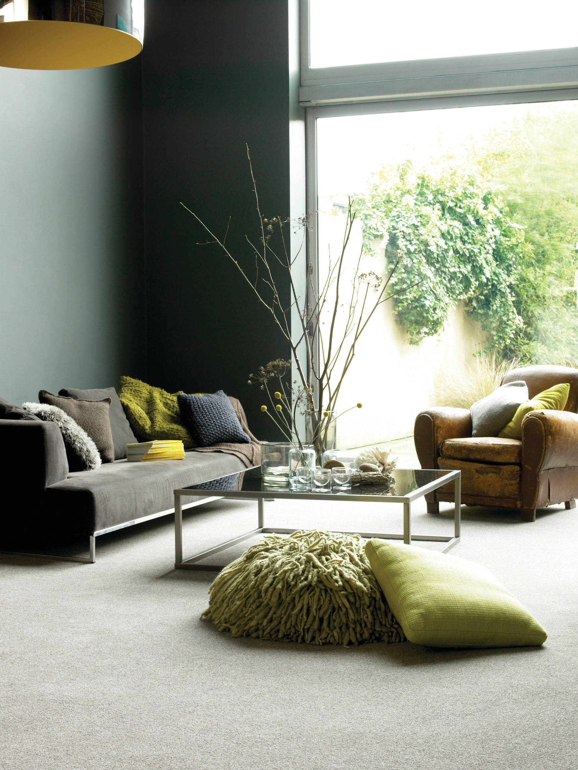 Dans la pièce de vie, les murs gris souris sont soulignés de vert céladon pour casser la monotonie.
