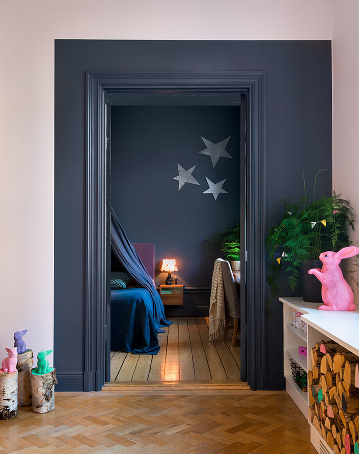 Dans cet appartement de Stockholm, on a même osé revisiter la chambre d’enfant en bleu de Sèvres ! Dès l’encadrement de la porte, la mise en couleur permet de délimiter l’espace nuit. Il est bien entendu accompagné d’accessoires qui le rendent magique plutôt que triste : des étoiles argentées, des lapins colorés pour accompagner les rêves enchantés !