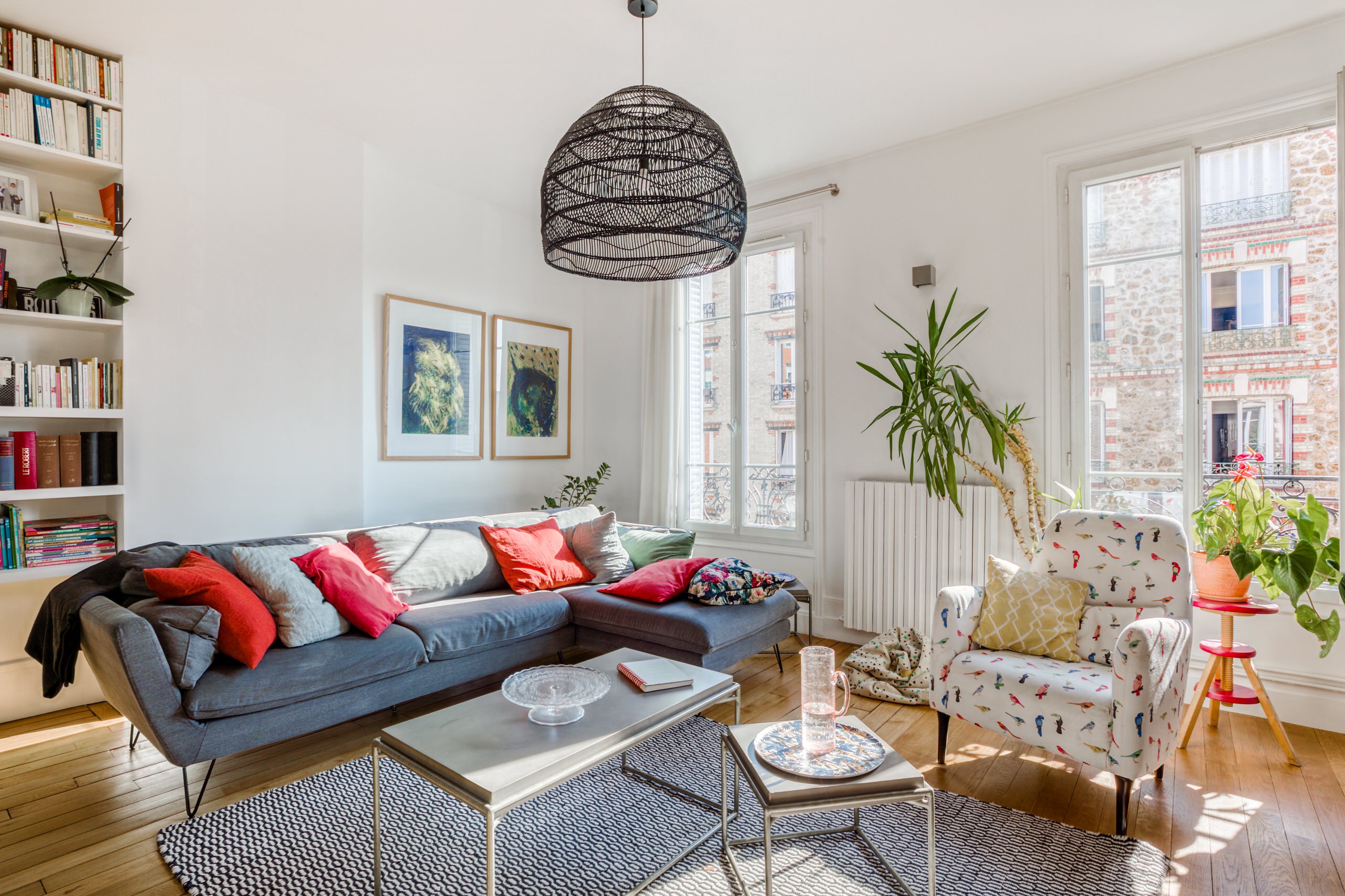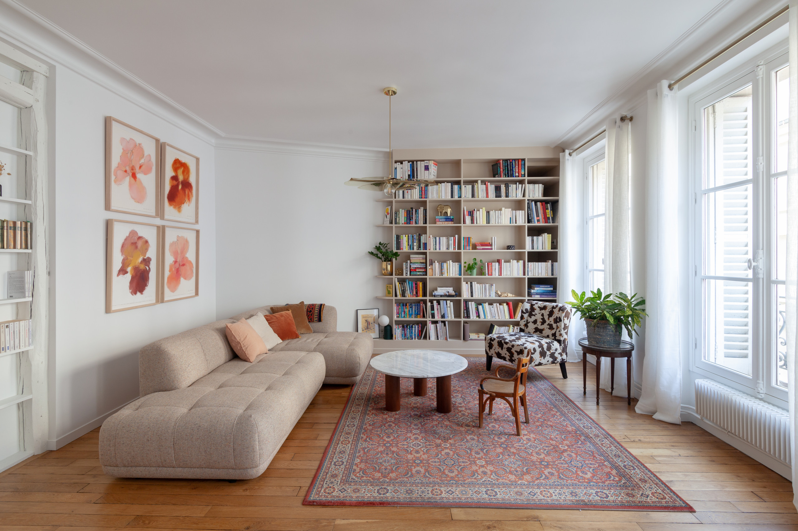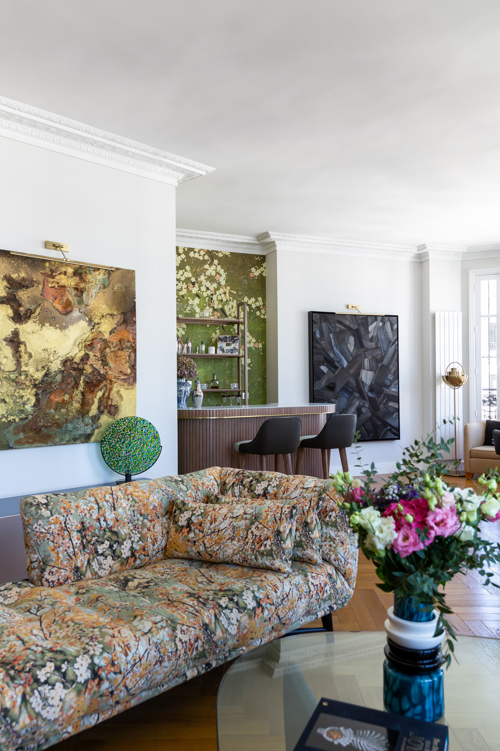 Les plus audacieux oseront le canapé 100 % floral, comme dans ce projet de l’agence Intérieurs Chomet. Les fleurs semblent être un véritable parti pris dans la décoration de ce salon puisqu’on les retrouve non seulement sur la banquette, mais aussi sur les murs de la cuisine. Notez que, s’il est plus difficile à adopter, le motif floral est un autre intemporel dont il serait bien dommage de se passer pour égayer les intérieurs. Ici, il prend part à une collection artistique, composée de tableaux, sculptures et autres œuvres originales.