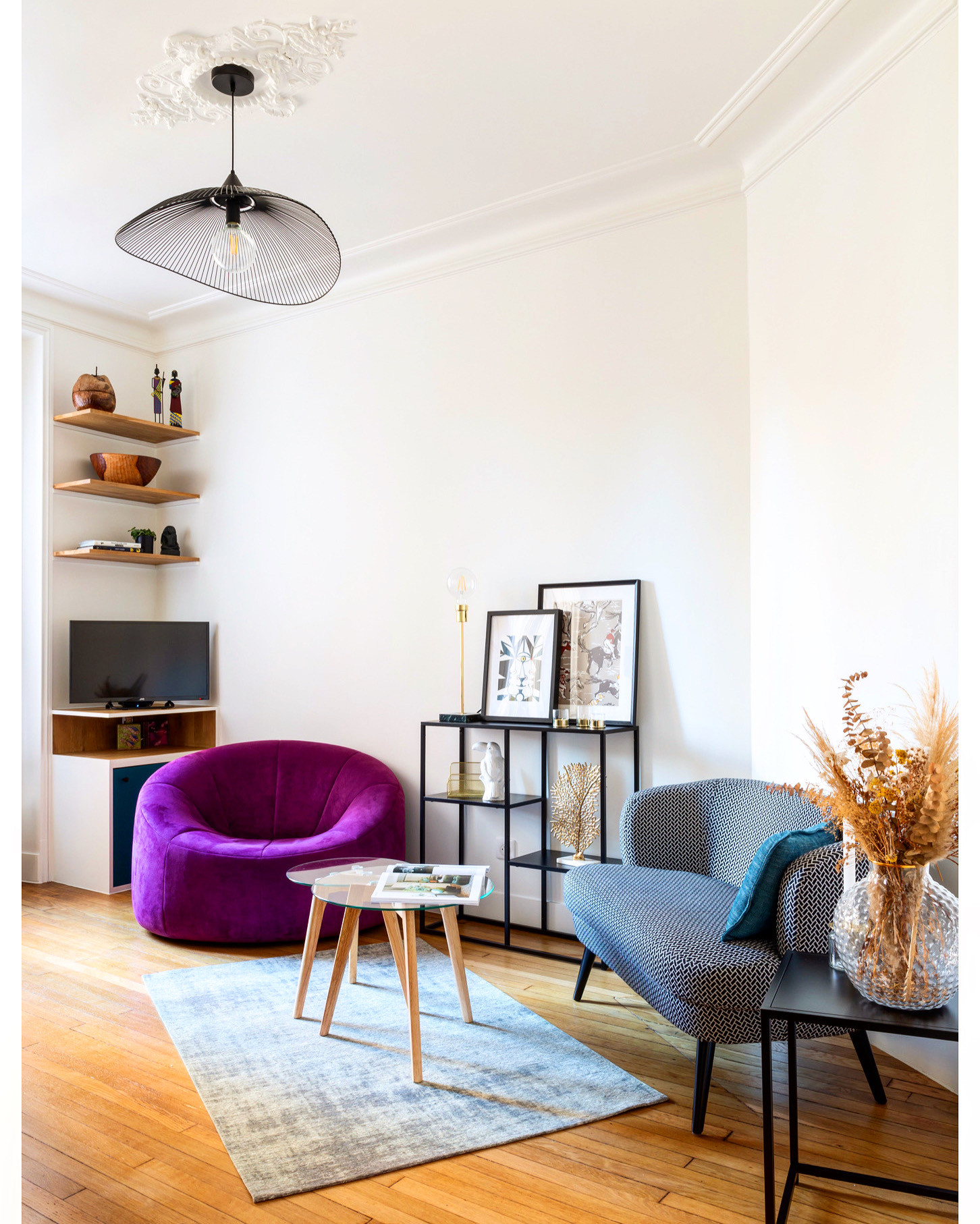 Dans ce projet réalisé par l’agence Ameo Concept, par exemple, les choix les plus audacieux ont été réalisés au niveau du canapé à motifs et du fauteuil violet. Le duo d’assises vient alors relever le cadre épuré de la décoration.