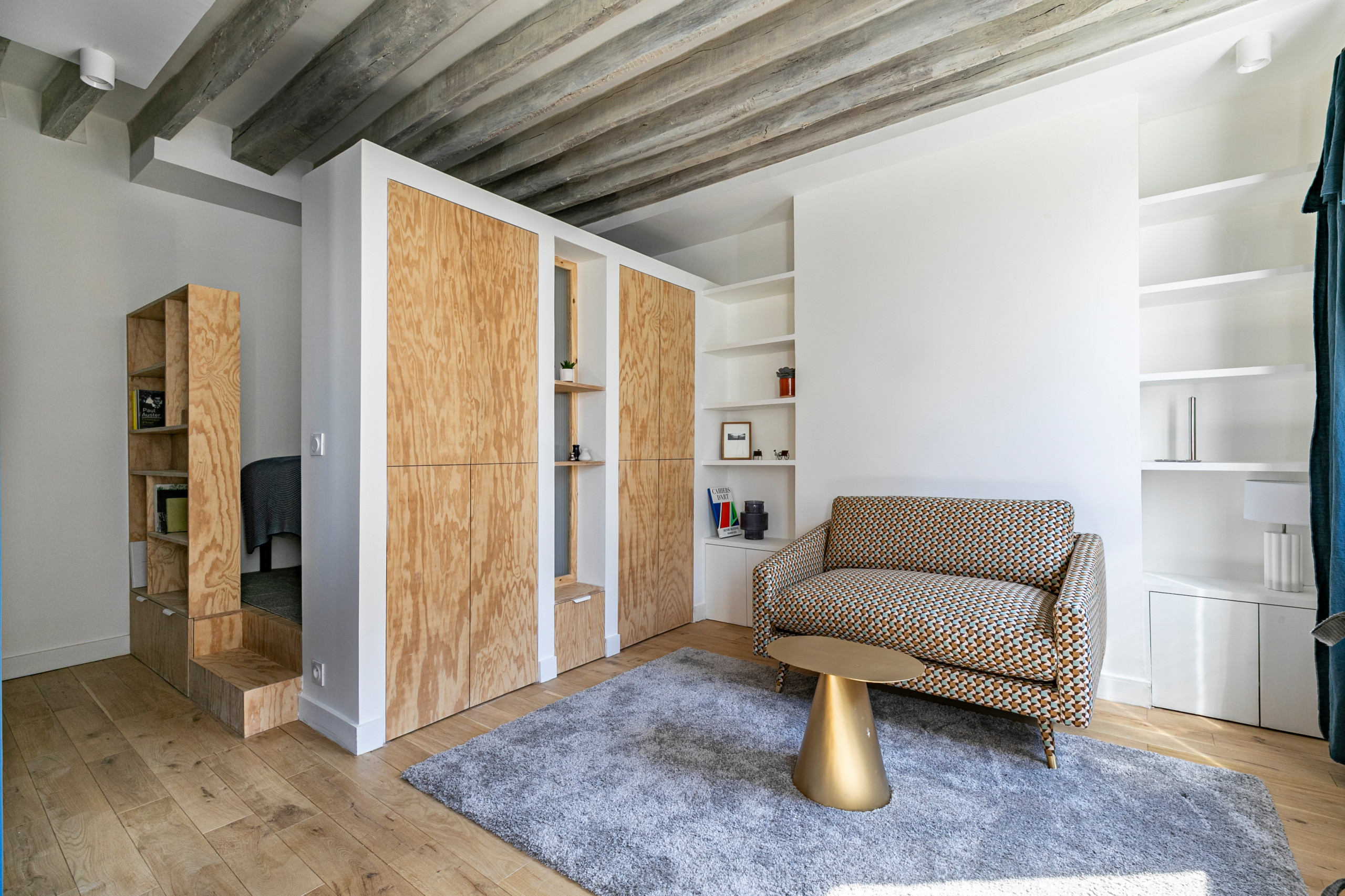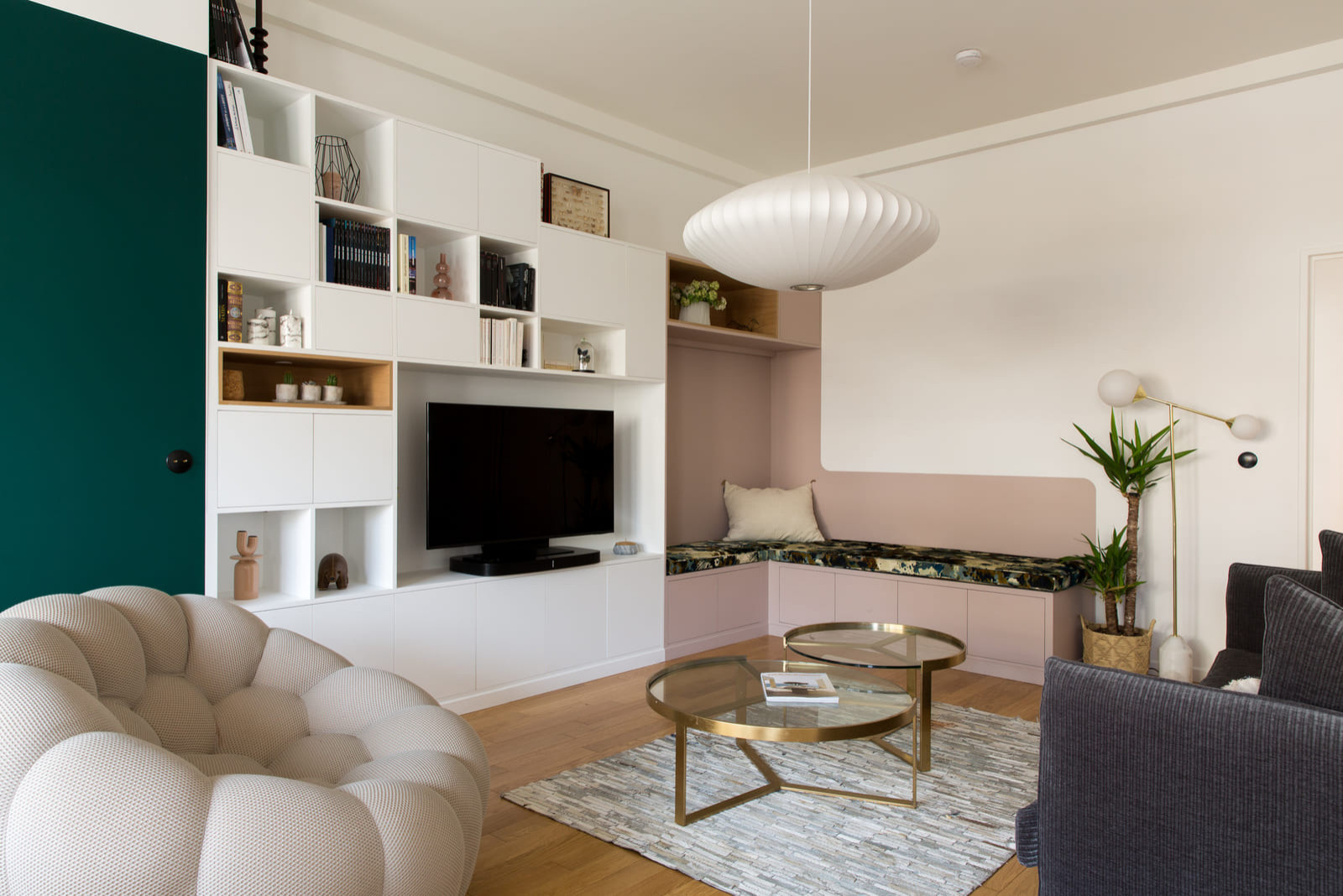 Dans cet autre projet, de l’agence Parisdinterieur, un simple rappel des couleurs de la banquette sur la porte suffit à créer un ensemble cohérent où les teintes se répondent d’un bout à l’autre de l’espace. On apprécie également la manière dont le coin banquette est visuellement délimité grâce à une utilisation astucieuse de la peinture.