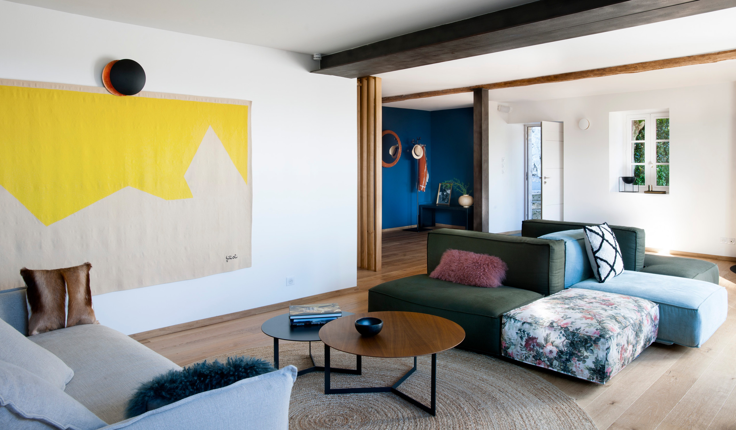 Cette idée de l’architecte d’intérieur Carole Dugelay mérite aussi d’être mise en avant. Pour meubler ce salon d’une maison de village, elle a choisi un canapé composé de plusieurs modules dépareillés dont l’un assume pleinement son motif floral. Les différentes teintes de l’imprimé sont reprises sur les autres parties du canapé pour créer un ensemble cohérent qui ne manque pas d’originalité.