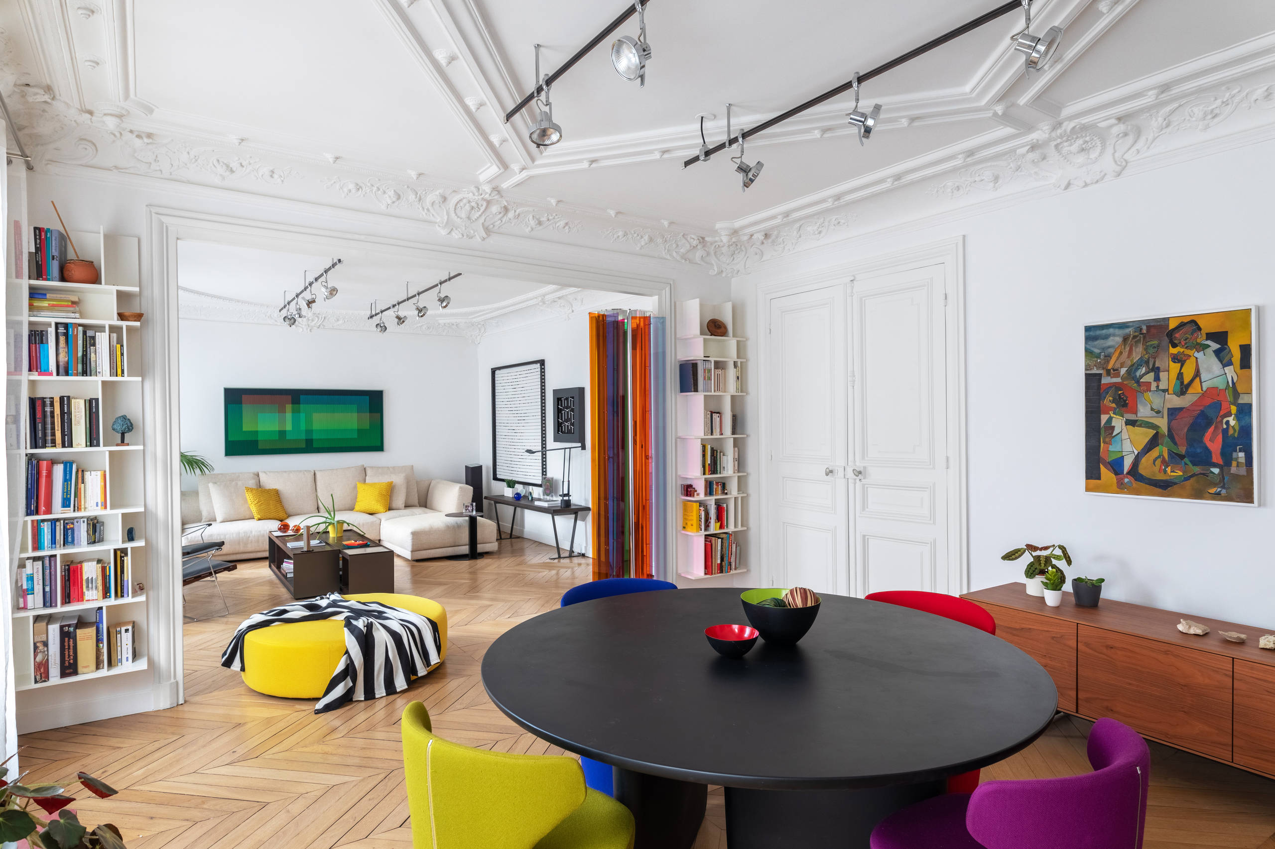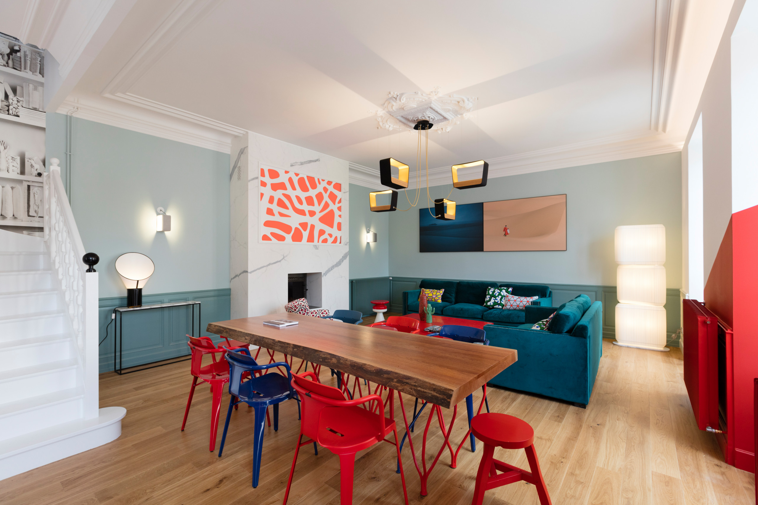 3. Pour un style éclectique arty. Que votre salon soit de style scandinave, votre cuisine de style indus’, votre salle de bain basique, il est tout à fait possible de leur apporter une touche pop pour un mélange de style réussi. Petite visite de ce lieu de vie éclectique près de Paris. Avec ses pieds de tables originaux et ses chaises vinted, ses pans de murs peints et luminaires arty, la pièce de vie est des plus accueillantes.