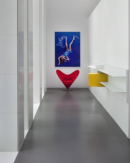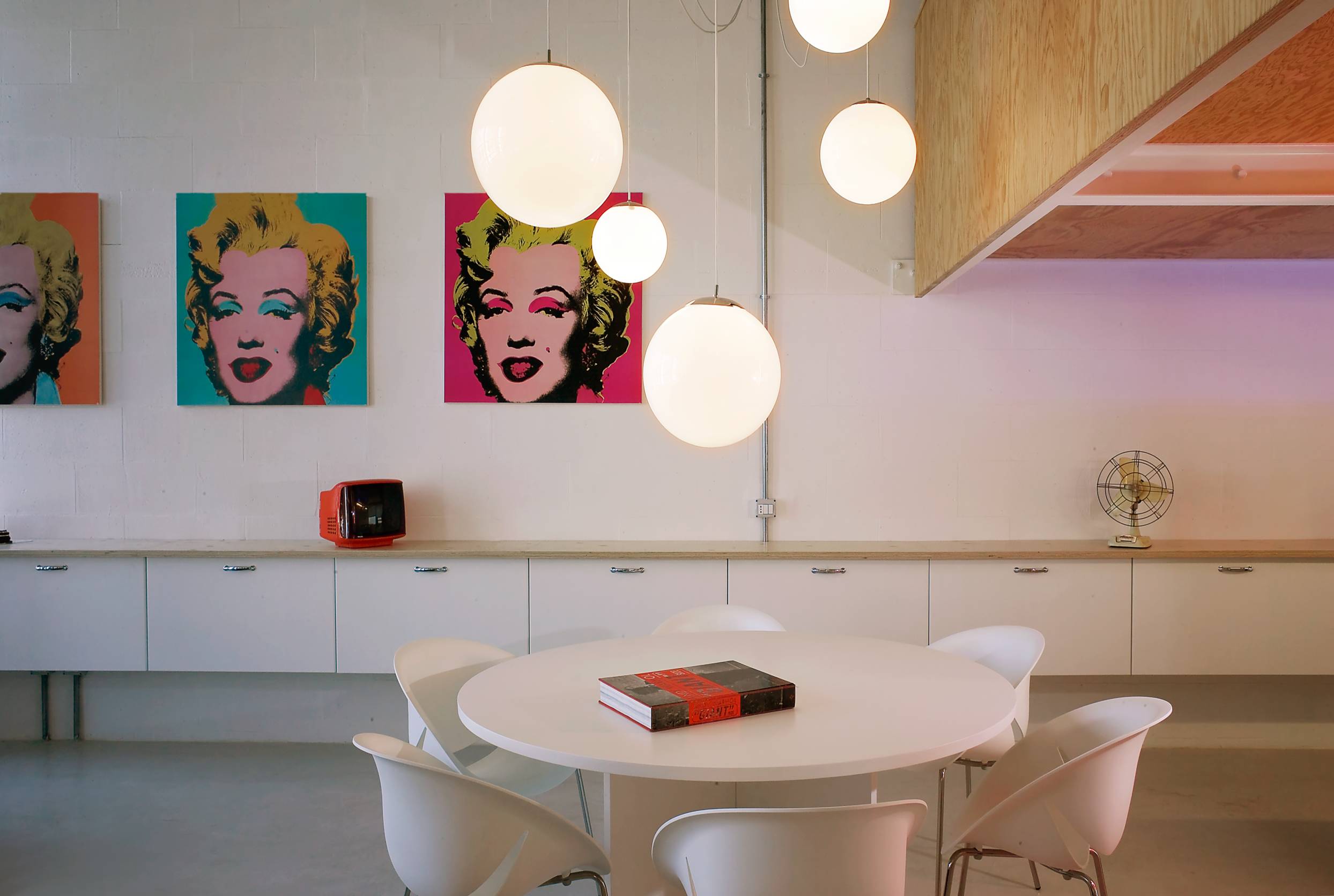 4. Avec un style épuré : ambiance galerie d’art. Des murs blancs, du mobilier blanc, de l’espace vide ? Parfait, le Pop Art va savoir le remplir en deux trois mouvements. Par exemple, trois reproductions du portrait de Maryline Monroe en trois teintes différentes par Andy Warhol et un ou deux objets vintage bien ronds et colorés. Deuxième option : un fauteuil culte comme l’ultra glamour rouge Heart Cone Chair, avec juste une photographie colorée (ici, un bleu Klimt) et en option, un cube de rangement jaune citron.