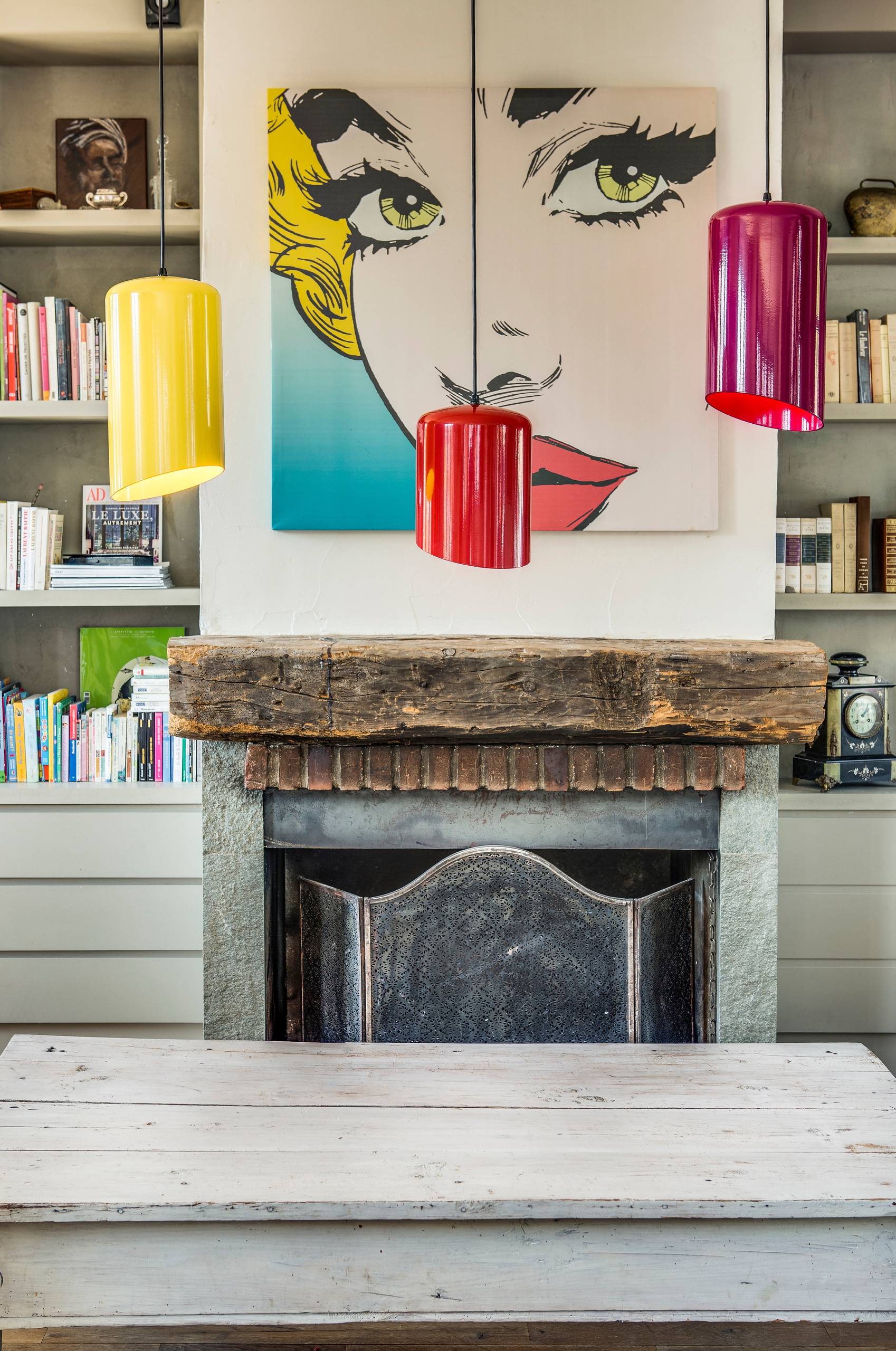 5. Mixer ancien et pop. Association a priori improbable et pourtant réussie, comme celle d’intégrer quelques éléments pop à un style rustique, campagne ou bourgeois. Dans cette pièce de vie, un agrandissement d’une vignette de comics remplace la tête de cerf, trois lampes brillantes et colorées, dépareillées, la suspension en fonte et le tour est joué : l’ancien est réveillé, titillé, épris de jeunesse, voire amouraché.