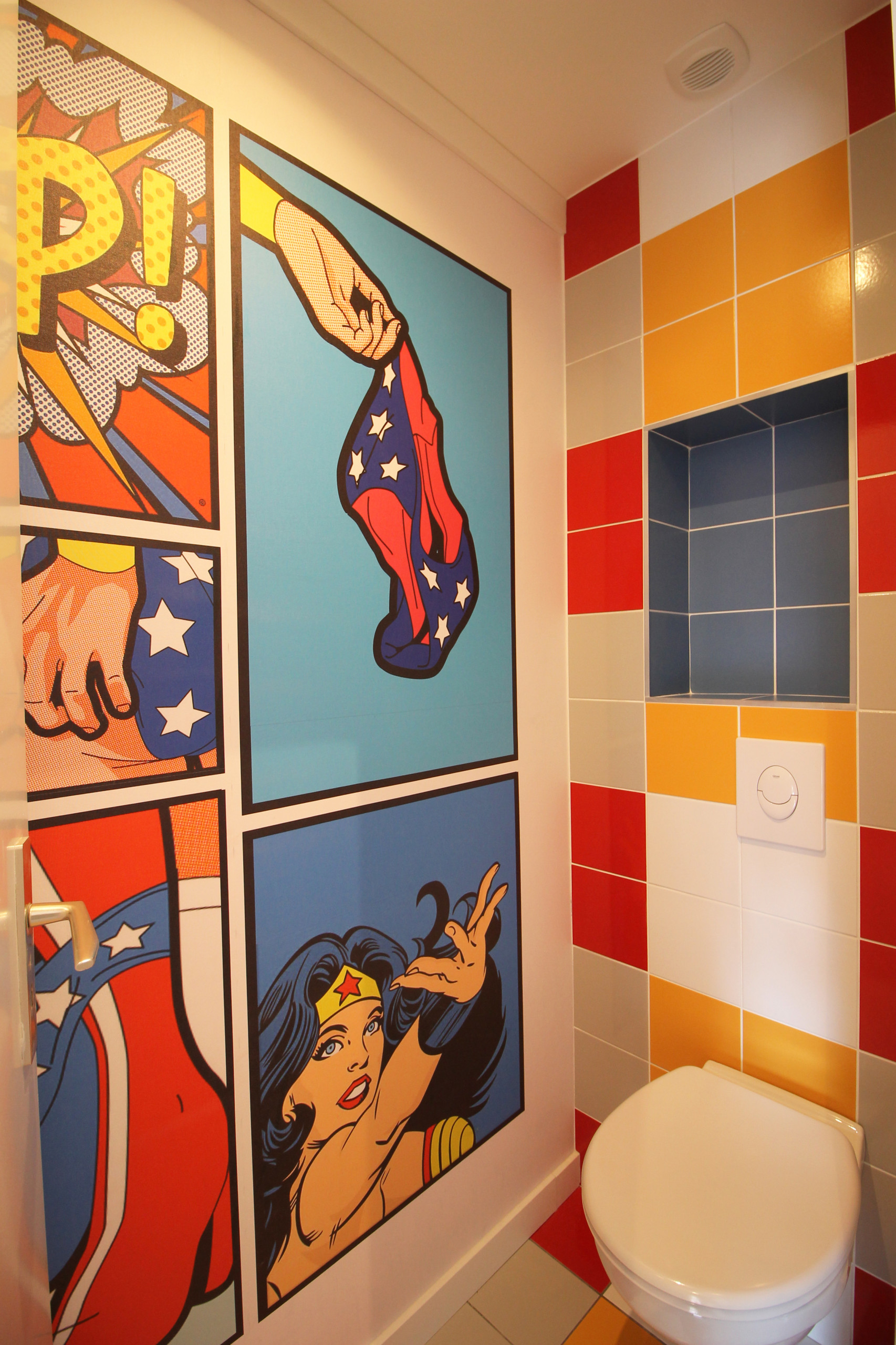 Côté bureau, on retrouve les mêmes codes couleurs sur une base de rouge primaire, assortie au bleu ciel. Très Marvel… Puis aux toilettes, on ose plonger dans l’univers des comics, avec Wonderwoman et le symbole de l’Amérique, façon on ne peut plus ludique.