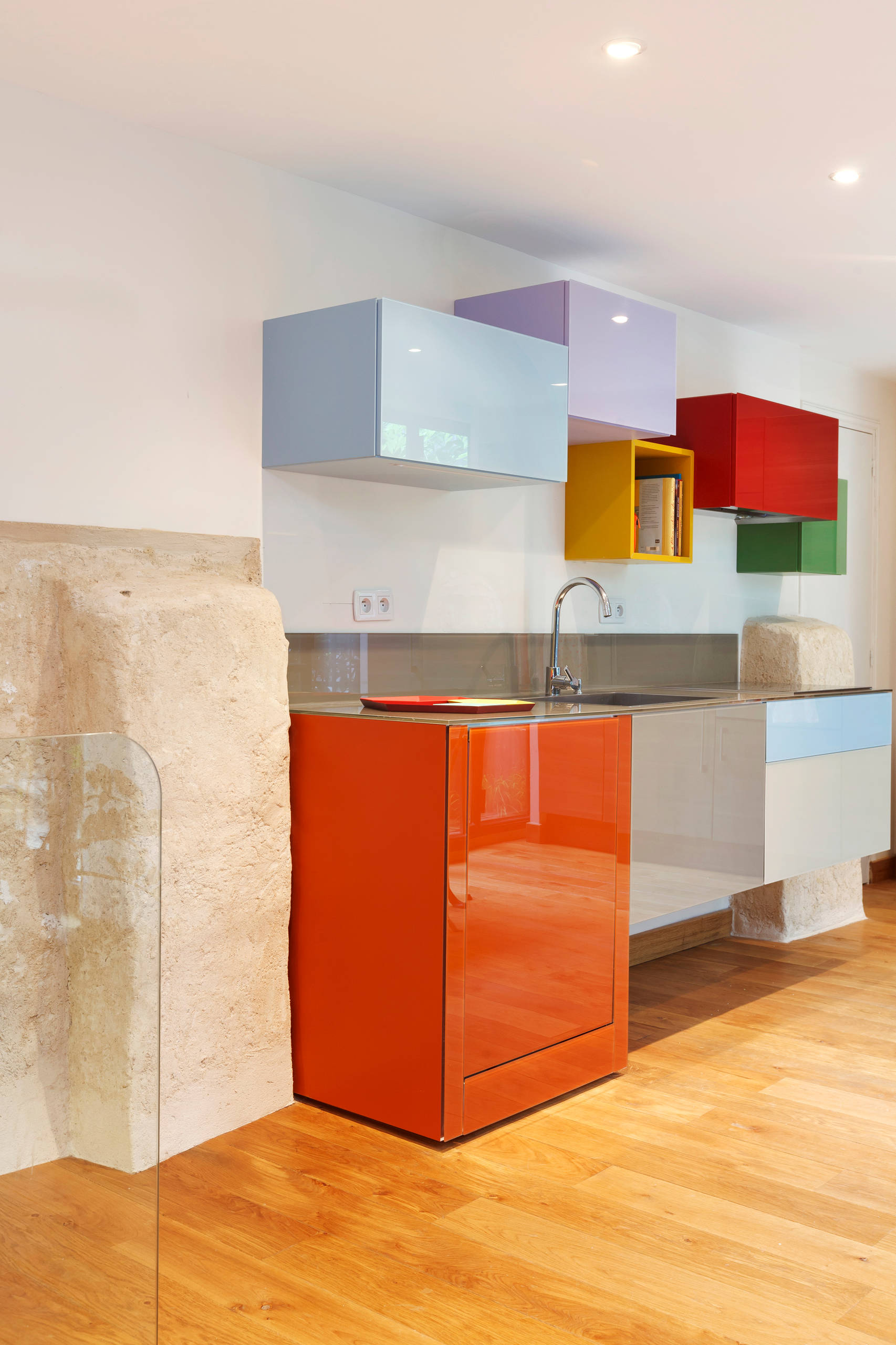 1. Couleurs et design contemporain. Rien de tel pour réveiller son intérieur ! Les couleurs acidulées et laquées rompent avec le mat, le blanc, le noir. Elles dynamisent les formes, surtout si elles semblent être placées aléatoirement. Ici, deux cuisines jouent la carte de l’espièglerie, façon chic ou casual.