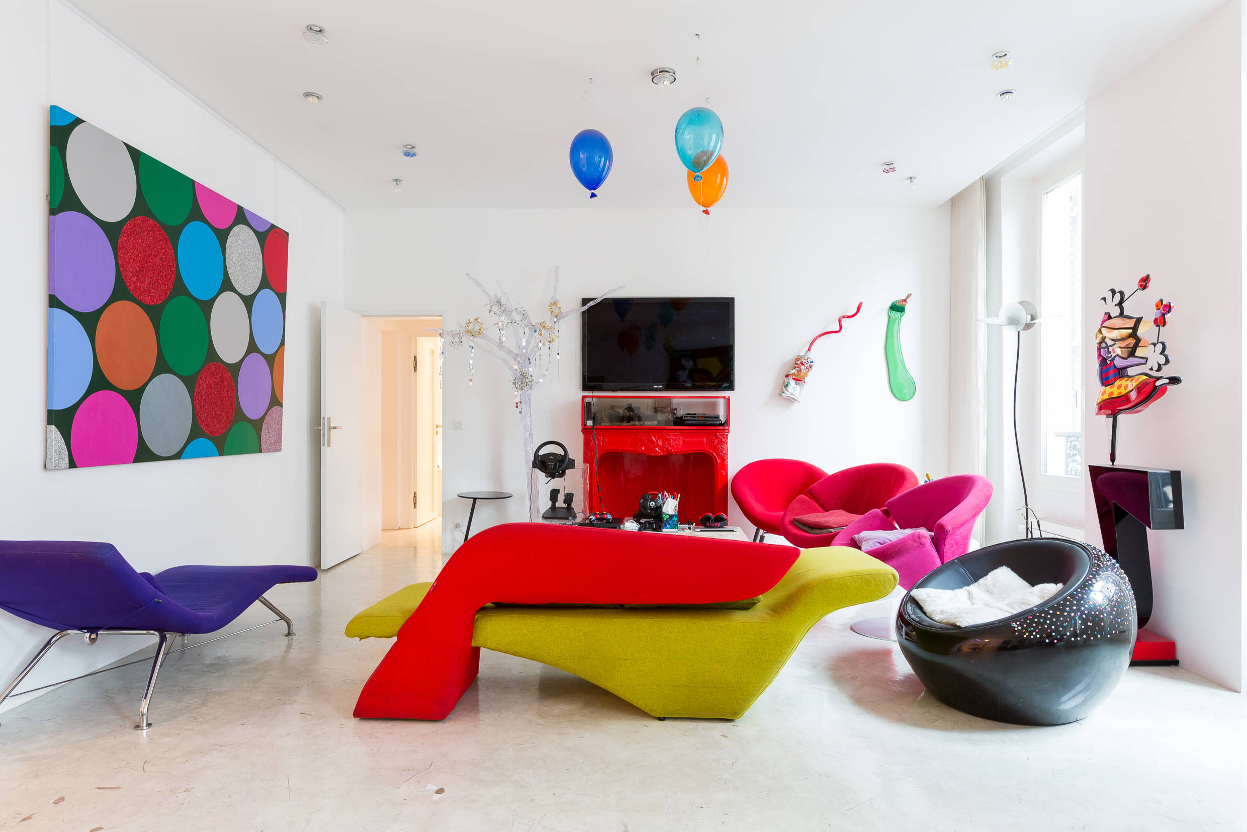 3. Des objets cultes et vintage. Depuis plusieurs décennies, le mobilier retro pop est très recherché. Les designers les plus célèbres – Verner Panton, Eero Arnio, Pierre Paulin, Roy Lichtenstein – demeurent très côtés, voire réédités. Les matériaux sont brillants, composés de PVC, Plexiglas, de piétement parfois en métal peint, du bois parcimonieusement. Les lignes sont vraiment arrondies, se courbent pour épouser le corps. À moins que ce ne soit l’inverse.