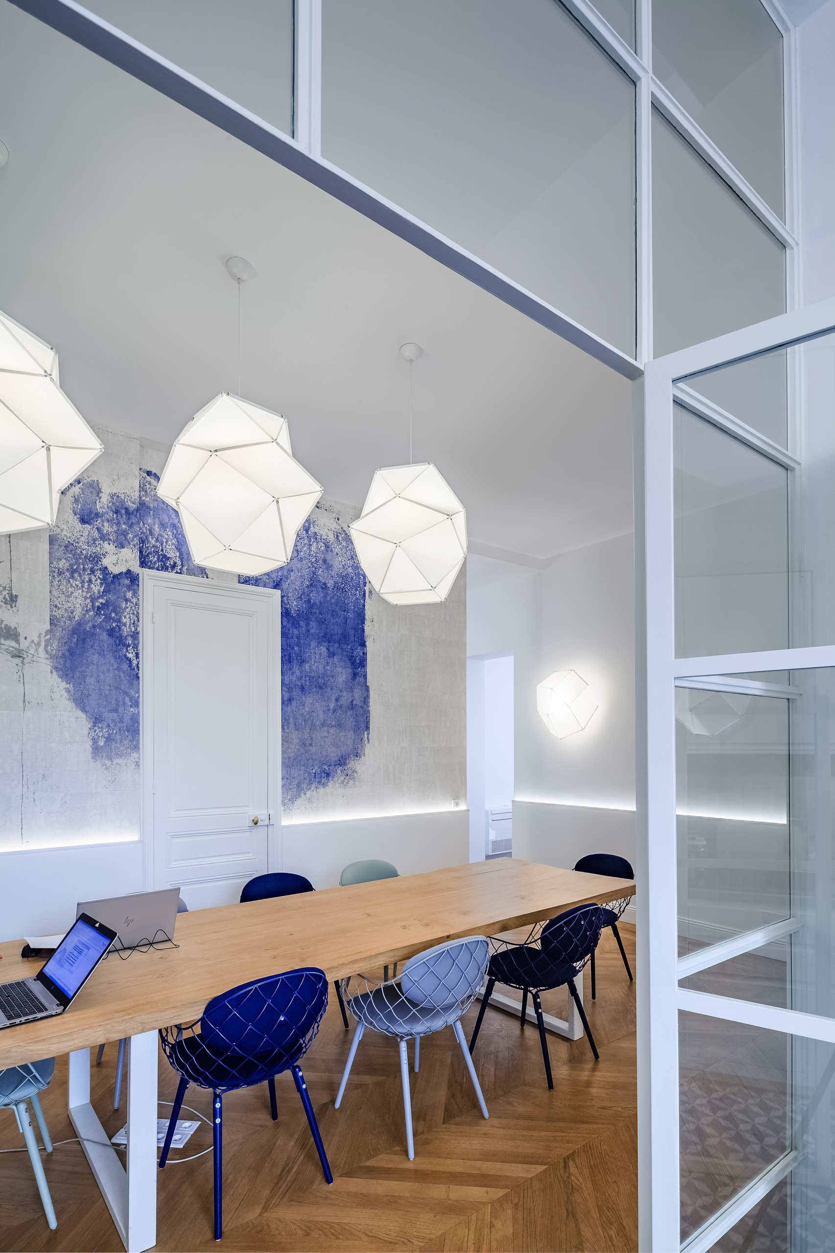 Quant à Amandine Maroteaux, elle nous souffle son installation préférée personnelle en home office : « Un plateau de travail positionné devant la fenêtre, éclairé par une suspension centrale et deux appliques de part et d’autre de la surface vitrée, tournant le dos à une menuiserie intégrant des LED dans des capuchons sablés. Sur le plateau, une lampe articulée orientable. »
