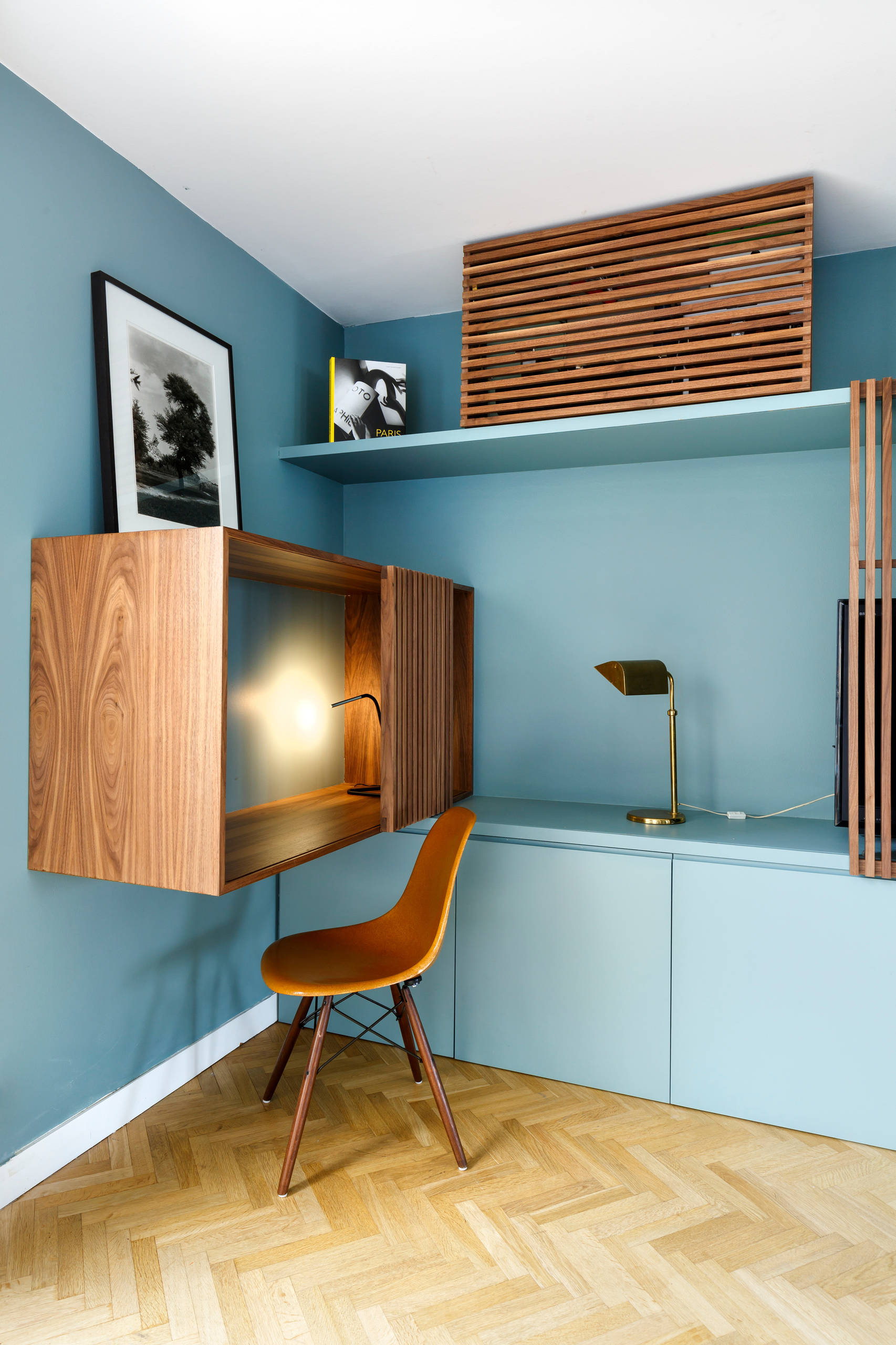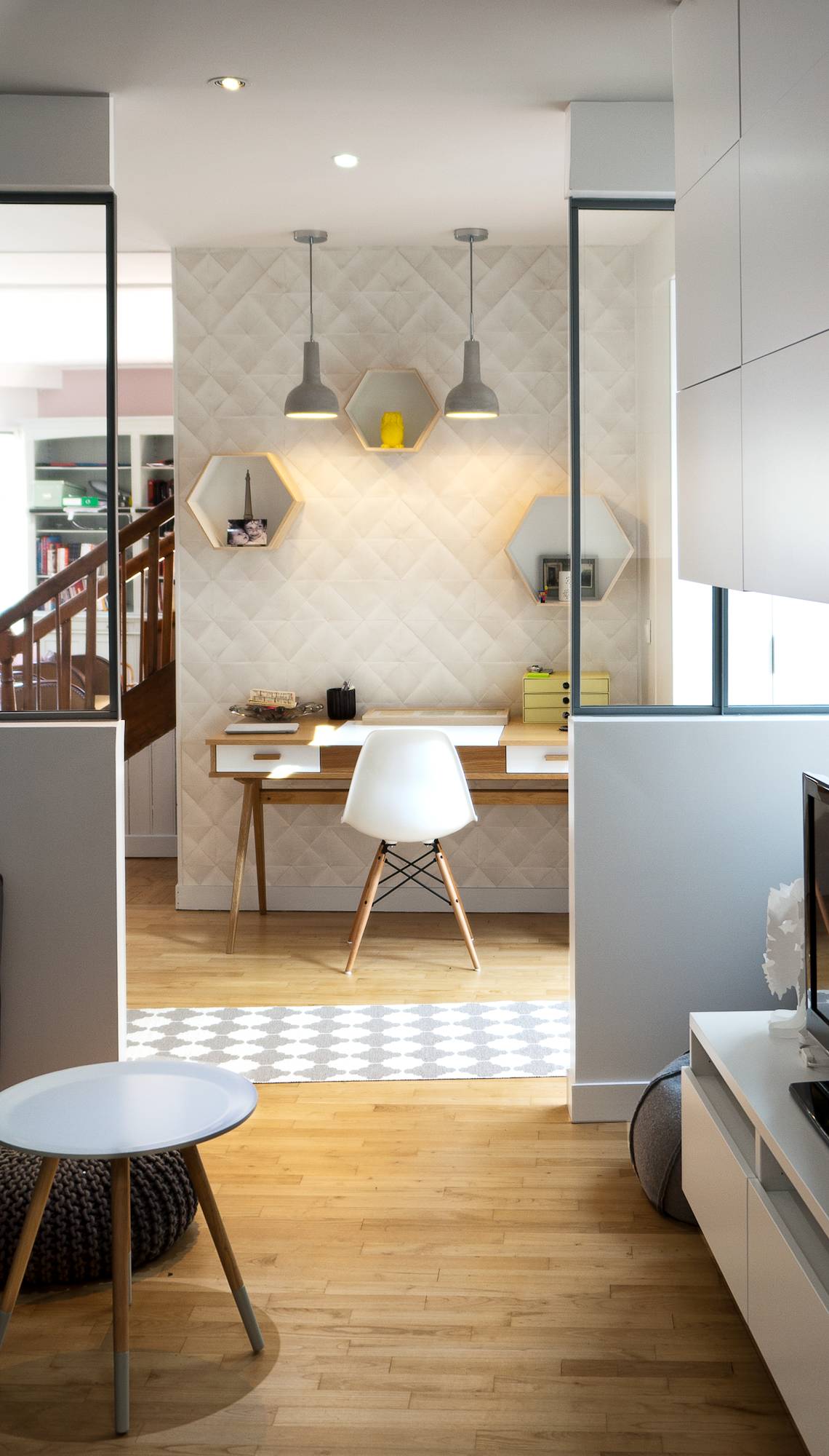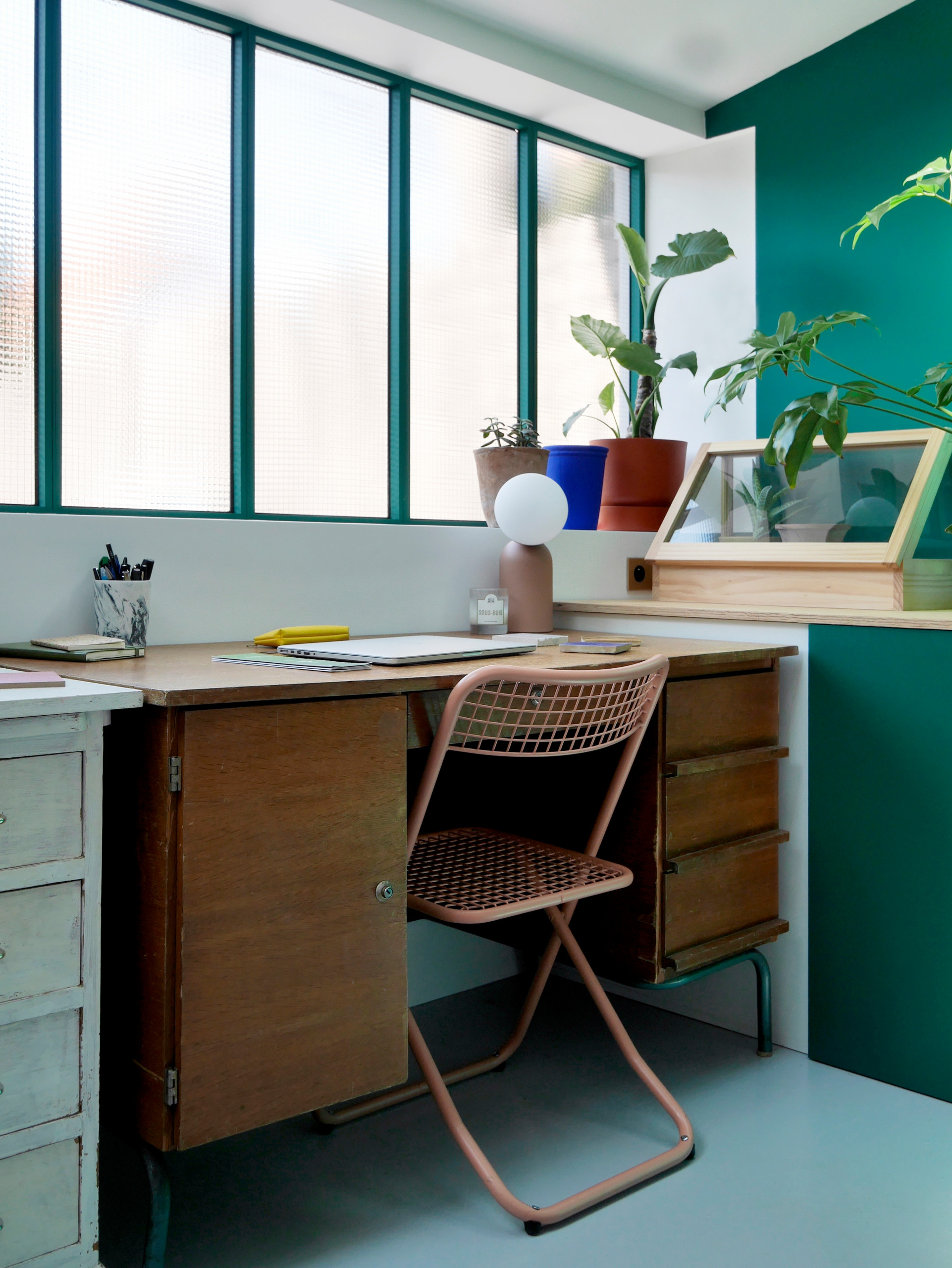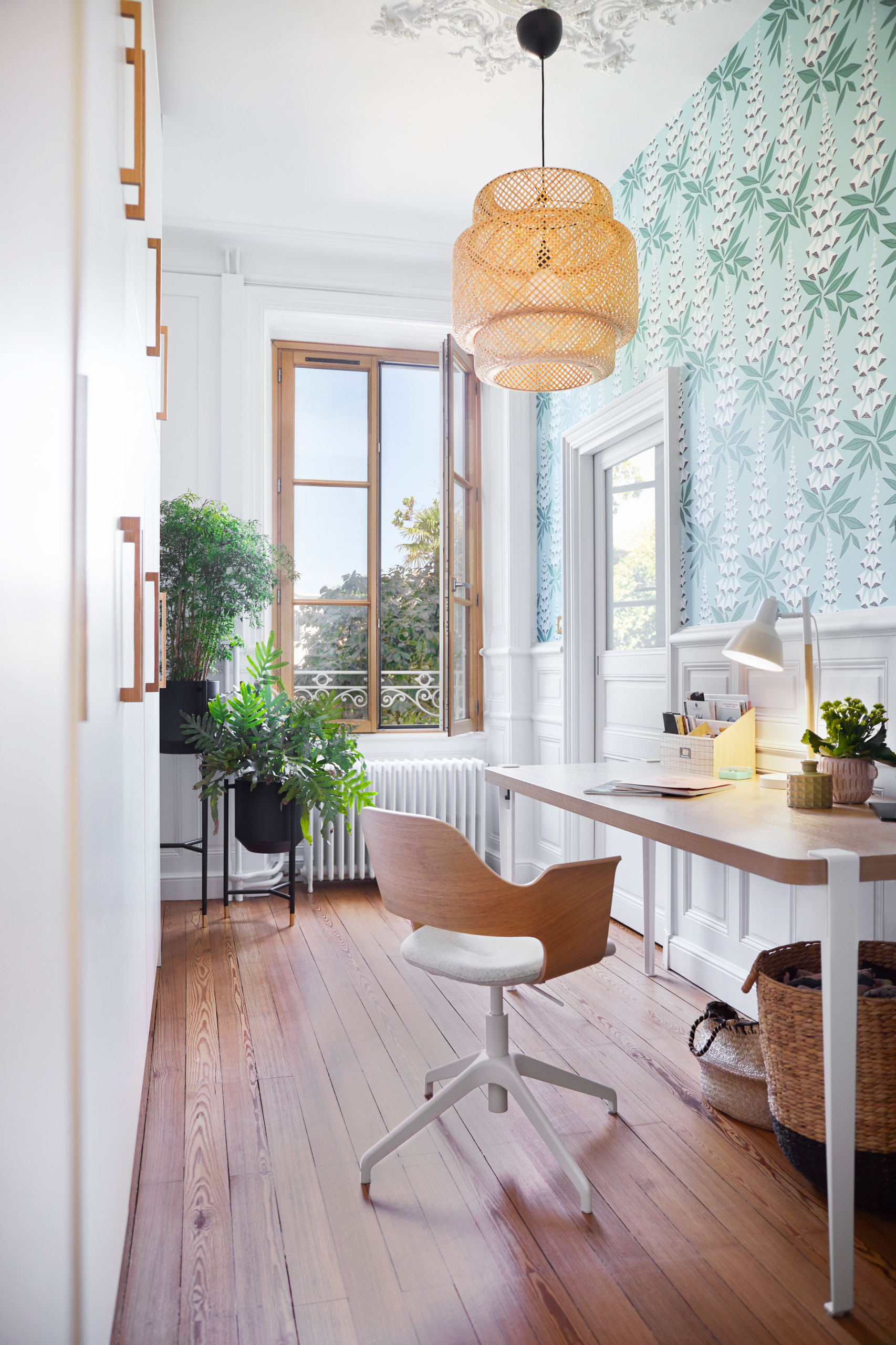 Autant que possible, notre experte conseille de travailler face à une fenêtre et aime concevoir le bureau comme un grand plateau juste au niveau des allèges. Même son de cloche chez Nicolas Payet de l’agence d’architecture intérieur Marn déco qui vient de faire refaire ses locaux professionnels dans l’esprit home office : « Il faut privilégier l’installation du bureau près d’une fenêtre pour bénéficier au maximum de l’éclairage naturel et n’avoir besoin que d’une petite lampe à poser au coin de son bureau en fin de journée. »