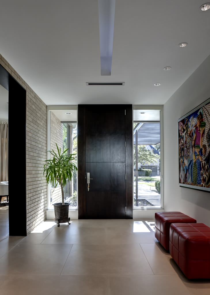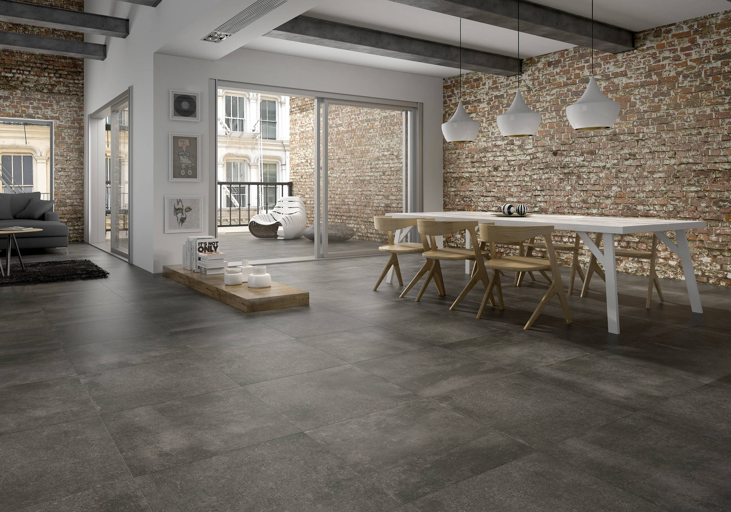 La tendances est aux grandes plaques rectifiées (c’est-à-dire à bords vifs) que l’on pose sans joint. En gris mat, comme dans cette pièce à vivre, c’est une solution alternative maligne à la dalle de béton coulé.