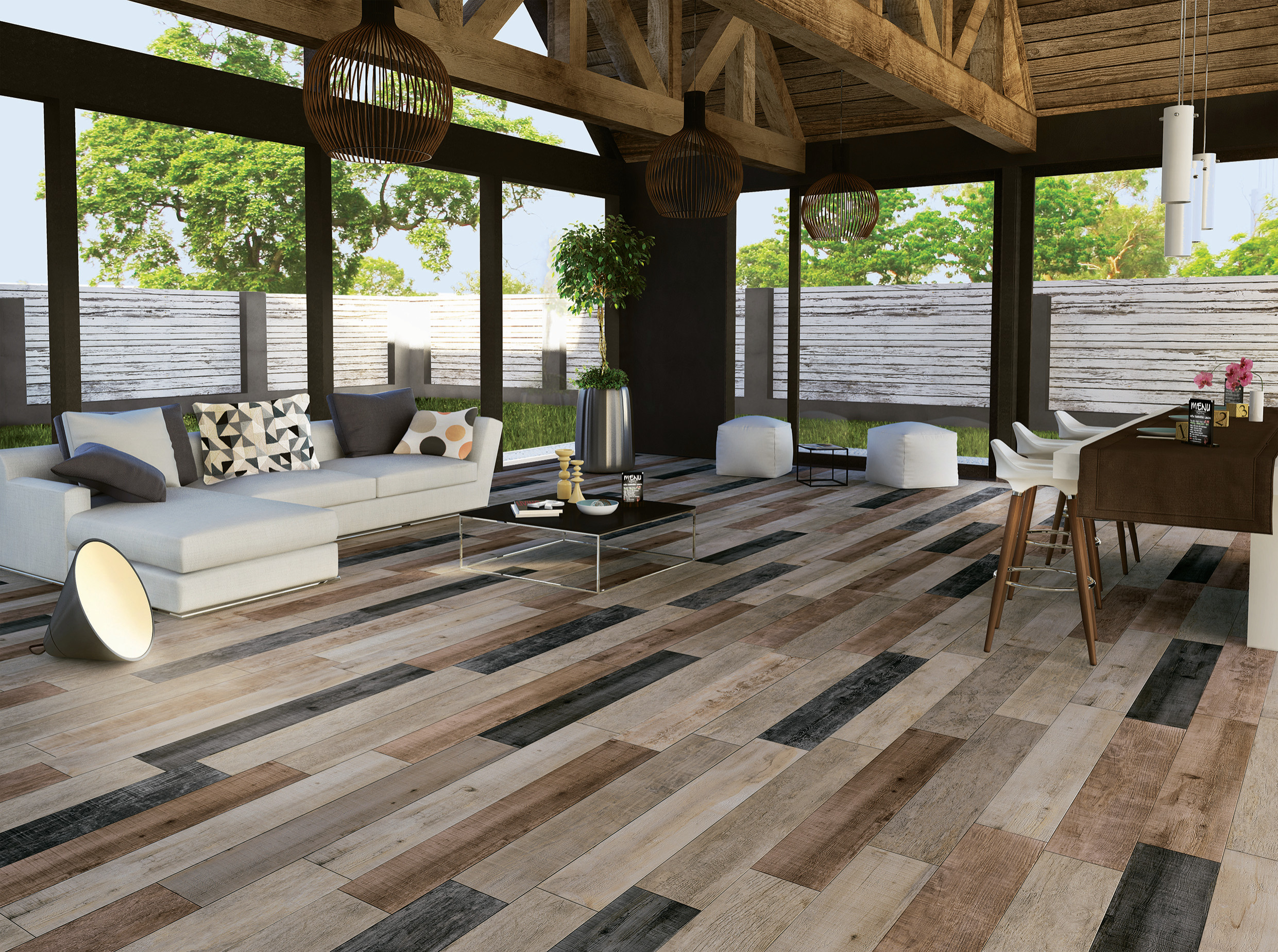 Question style, la vogue des imitations de carreaux ciment fait place à celle des matières naturelles (bois, pierre, métal, béton…) comme en a témoigné le dernier salon international des « tiles », le Cersaie de Bologne.