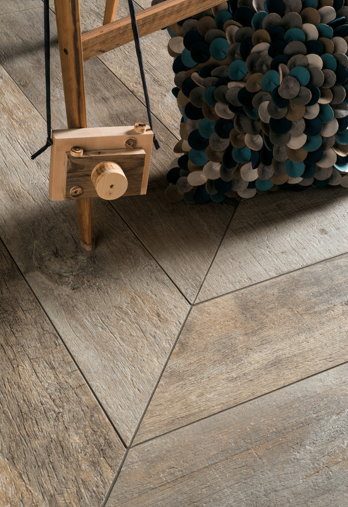 Le grès émaillé se décline en des dizaines de décors, imitant les matières naturelles. Ci-dessus, il ne s’agit pas de parquet, mais bel et bien de grès texturé de manière à imiter les veines du bois. Bluffant à la vue comme au toucher ! On note que les avancées techniques permettent dorénavant de donner un effet 3D à la matière, une autre grosse tendance repérée au dernier Cersaie.