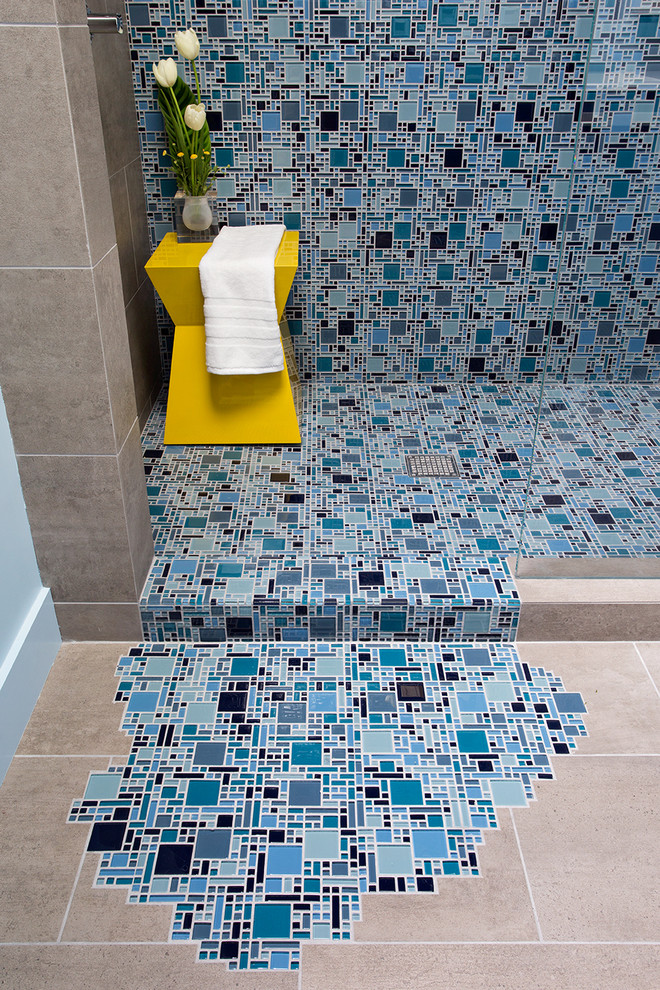 C’est sur les sols de salles de bains que l’on trouve la plupart des applications en mosaïque. La mosaïque de verre couvre même les sols des douches à l’italienne.